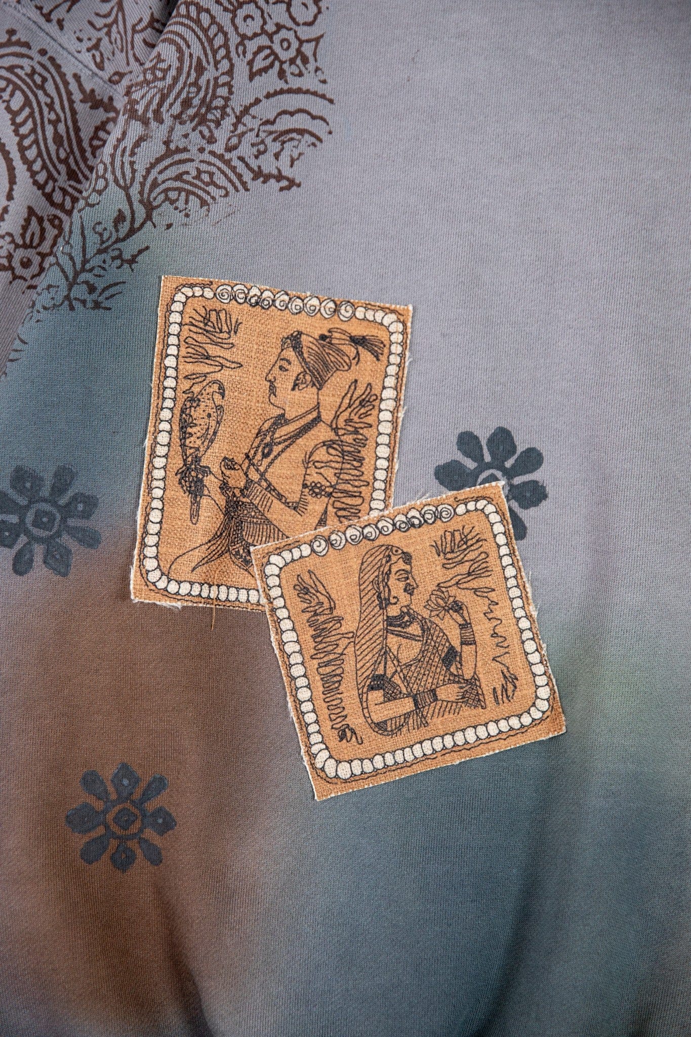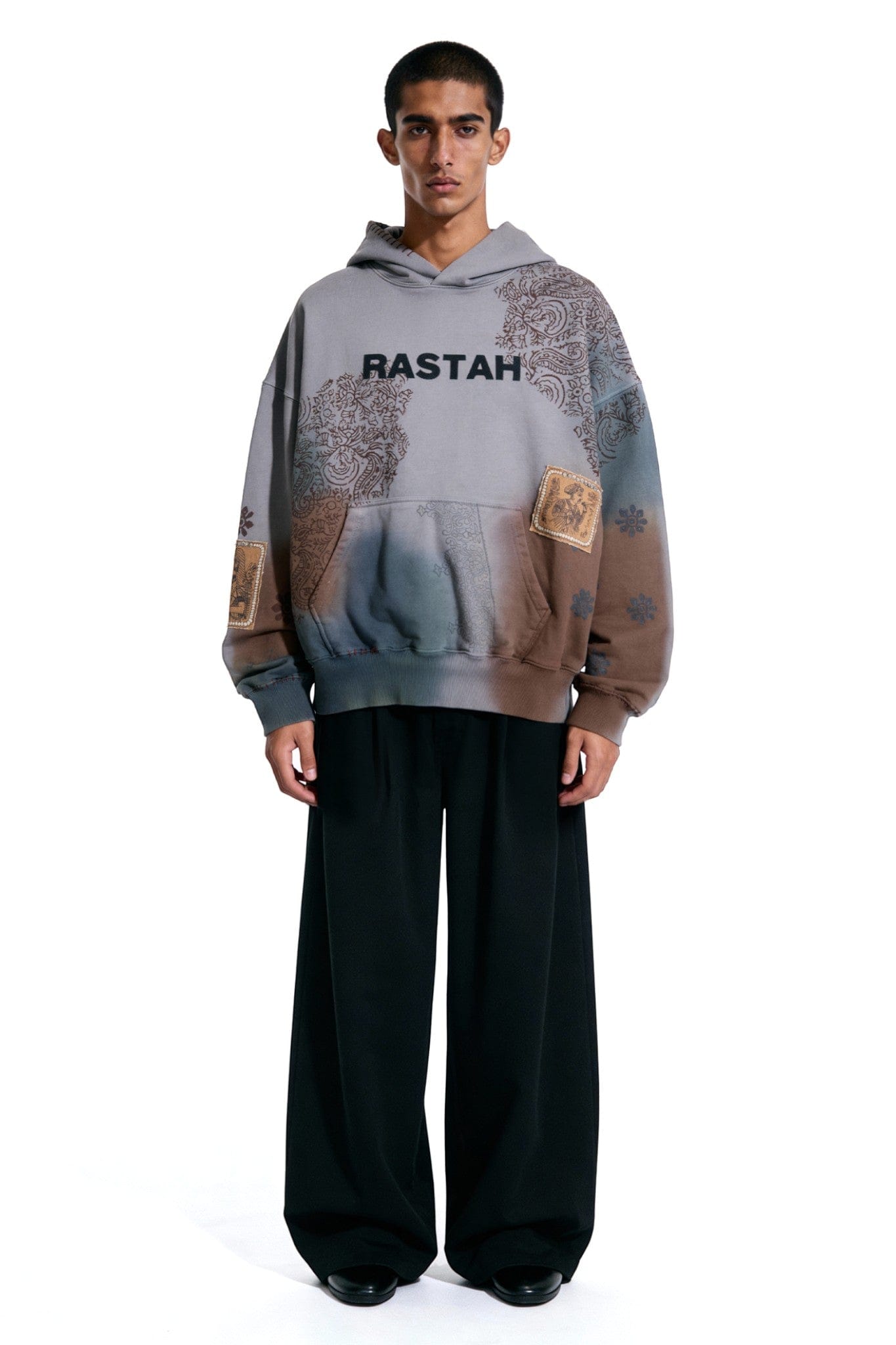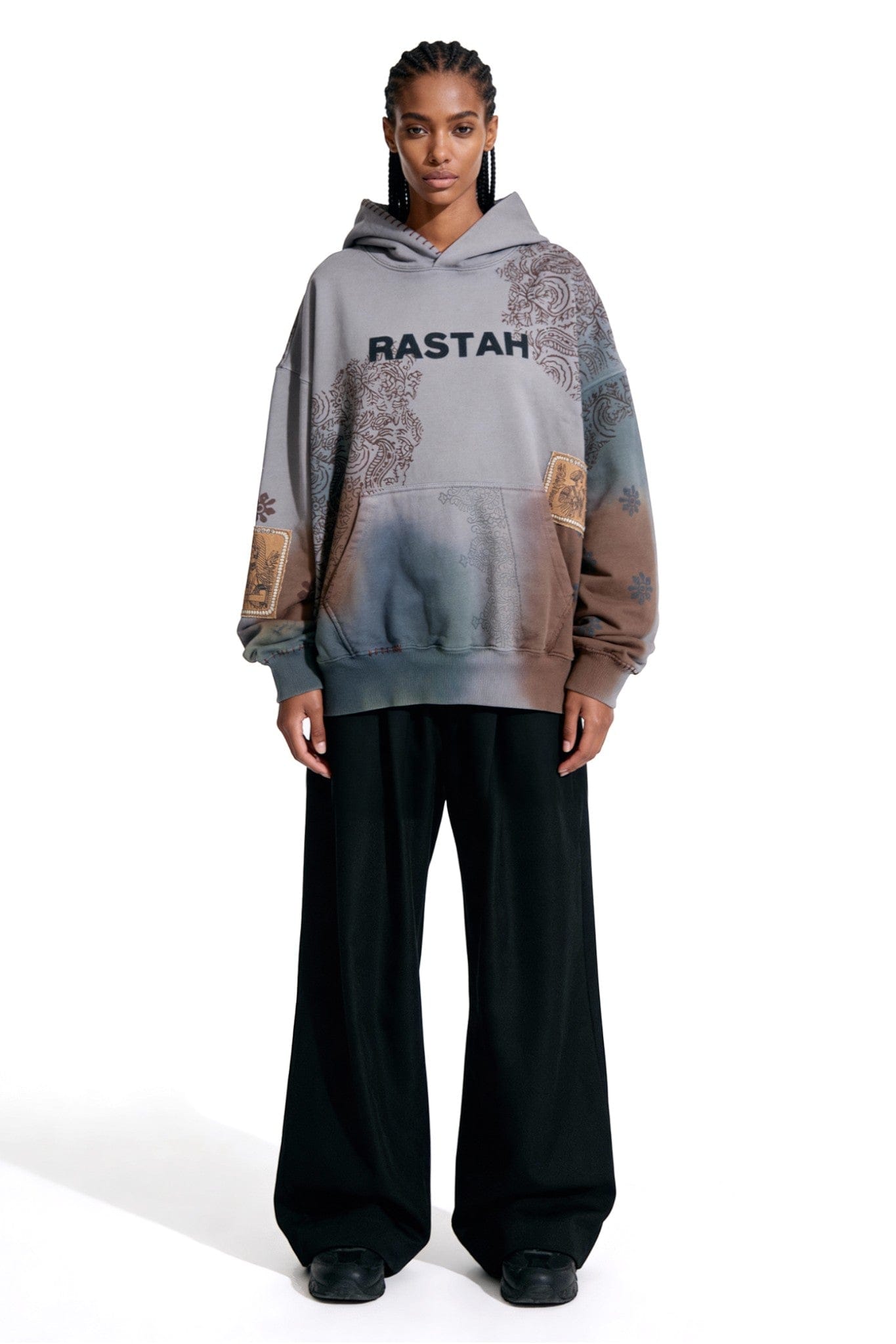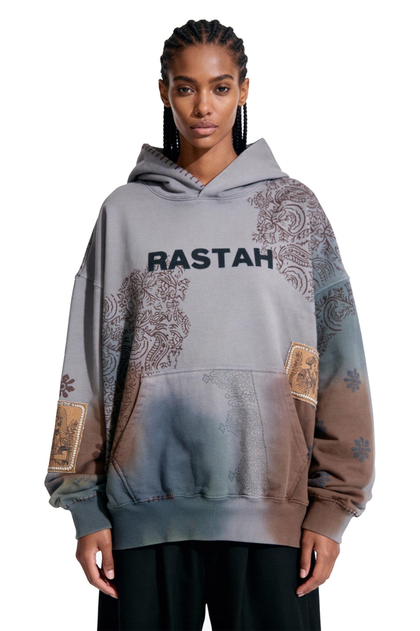 Crafted in 100% cotton fleece, the base offers warmth and structure while maintaining a lived-in, time-worn feel. The tie & dye treatment recalls uneven aging, while block-printed patterns appear like floral traces etched into old walls. Chenille embroidered Rastah branding anchors the garment in the present, contrasted with sublimation patches that feel archival and intimate. Hand stitches remain exposed — not hidden — marking moments of repair, care, and continuity.