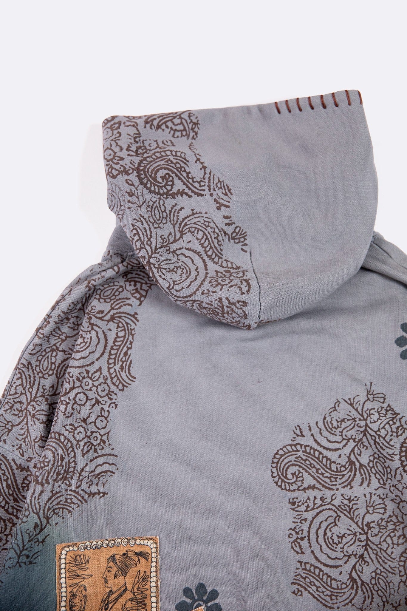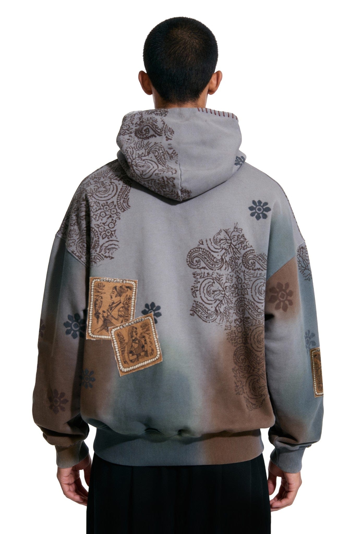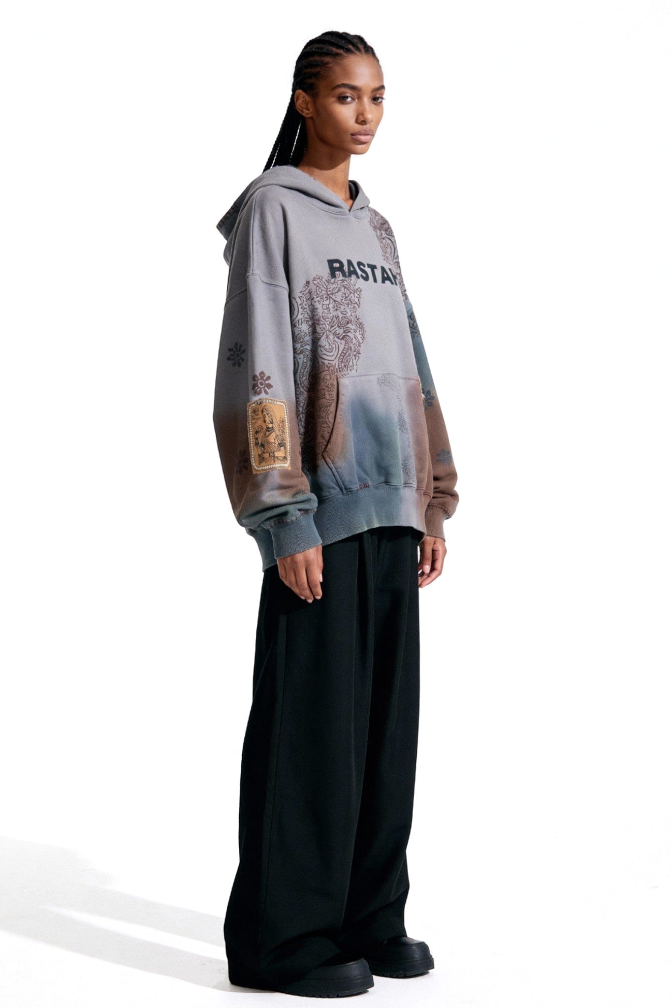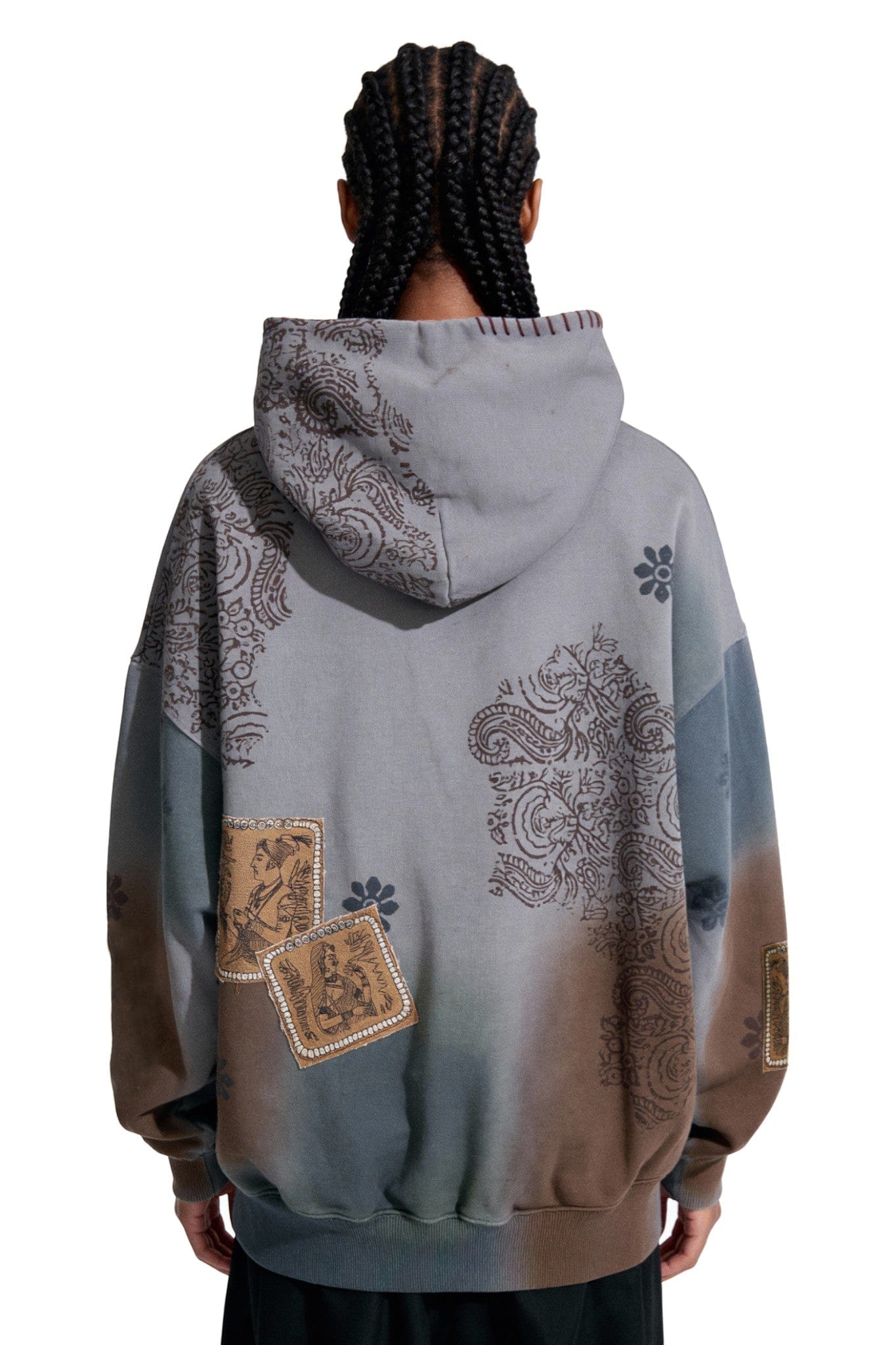 Crafted in 100% cotton fleece, the base offers warmth and structure while maintaining a lived-in, time-worn feel. The tie & dye treatment recalls uneven aging, while block-printed patterns appear like floral traces etched into old walls. Chenille embroidered Rastah branding anchors the garment in the present, contrasted with sublimation patches that feel archival and intimate. Hand stitches remain exposed — not hidden — marking moments of repair, care, and continuity.