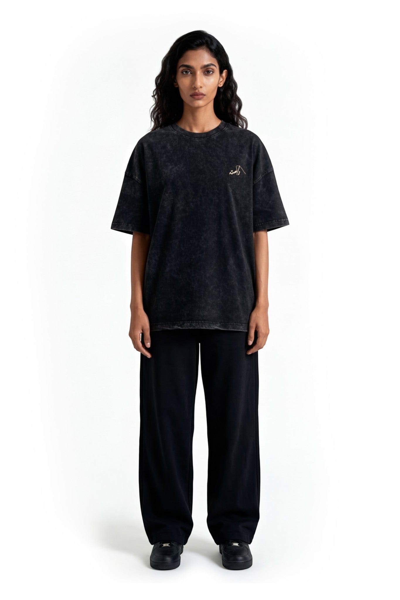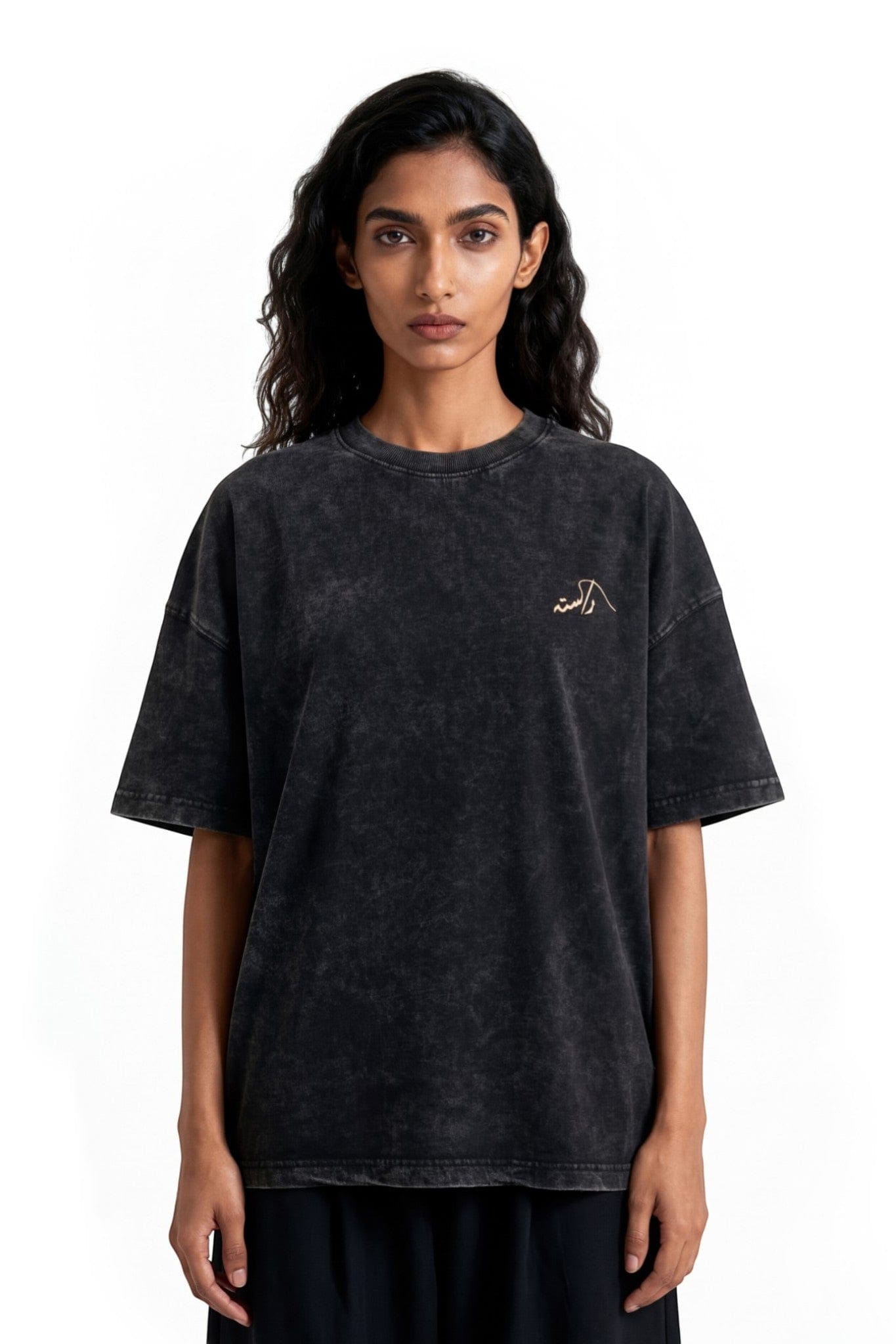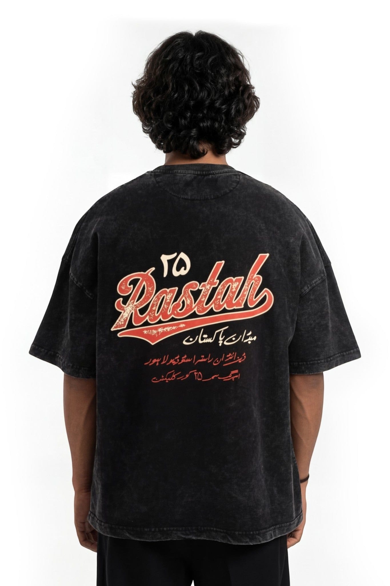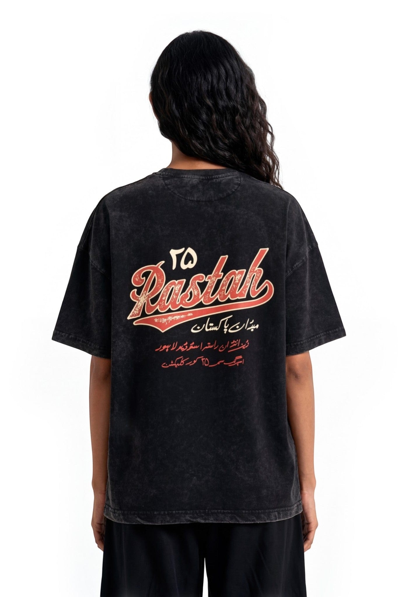 An oversized t-shirt crafted from 100% cotton jersey fabric in an acid wash black tone. Soft, breathable, and lightweight, it features a minimal screen-printed Urdu logo on the front and a bold bilingual screen print on the back, blending cultural expression with effortless streetwear energy.