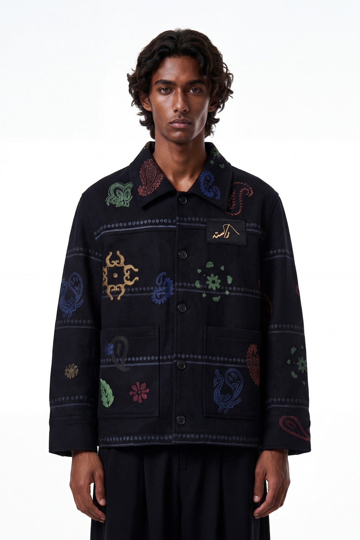 A reimagined workwear silhouette layered with tradition. This black denim jacket becomes a moving canvas, detailed with intricate block-printed motifs scattered across the surface in vibrant, contrasting hues. Horizontal dotted lines structure the composition, while paisleys, florals, and folk-inspired elements create rhythm and storytelling throughout.