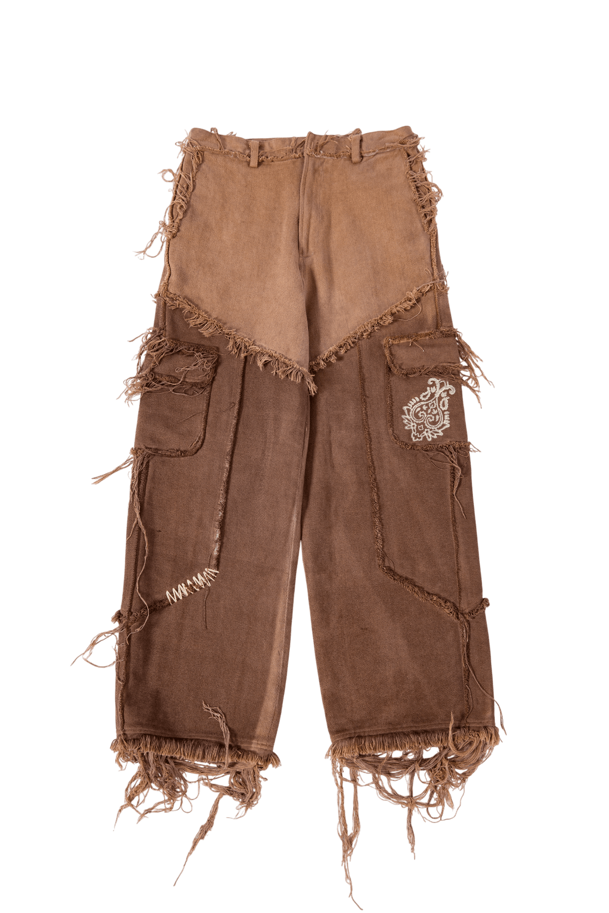 Crafted from heavyweight denim, these brown raw-edge pants merge artisanal craft with rugged streetwear design. Featuring hand-frayed edges, distressed fringes, and contrast fashion stitches, each piece carries a sense of raw individuality. Hand block-printed motifs on the pockets bring a cultural depth, while multiple cargo-style pockets add utility. Designed for those who embrace imperfection as style, these pants embody freedom, resilience, and modern heritage.