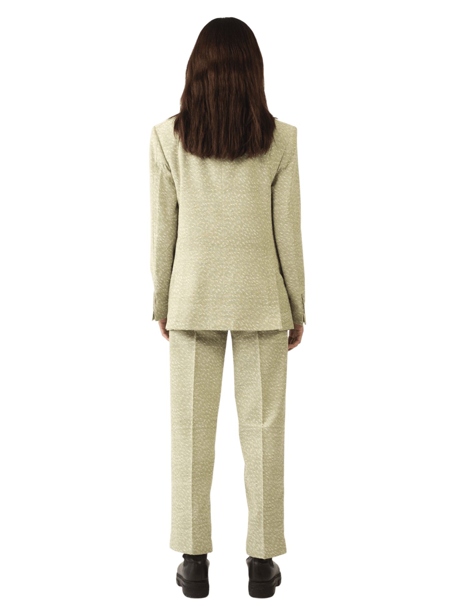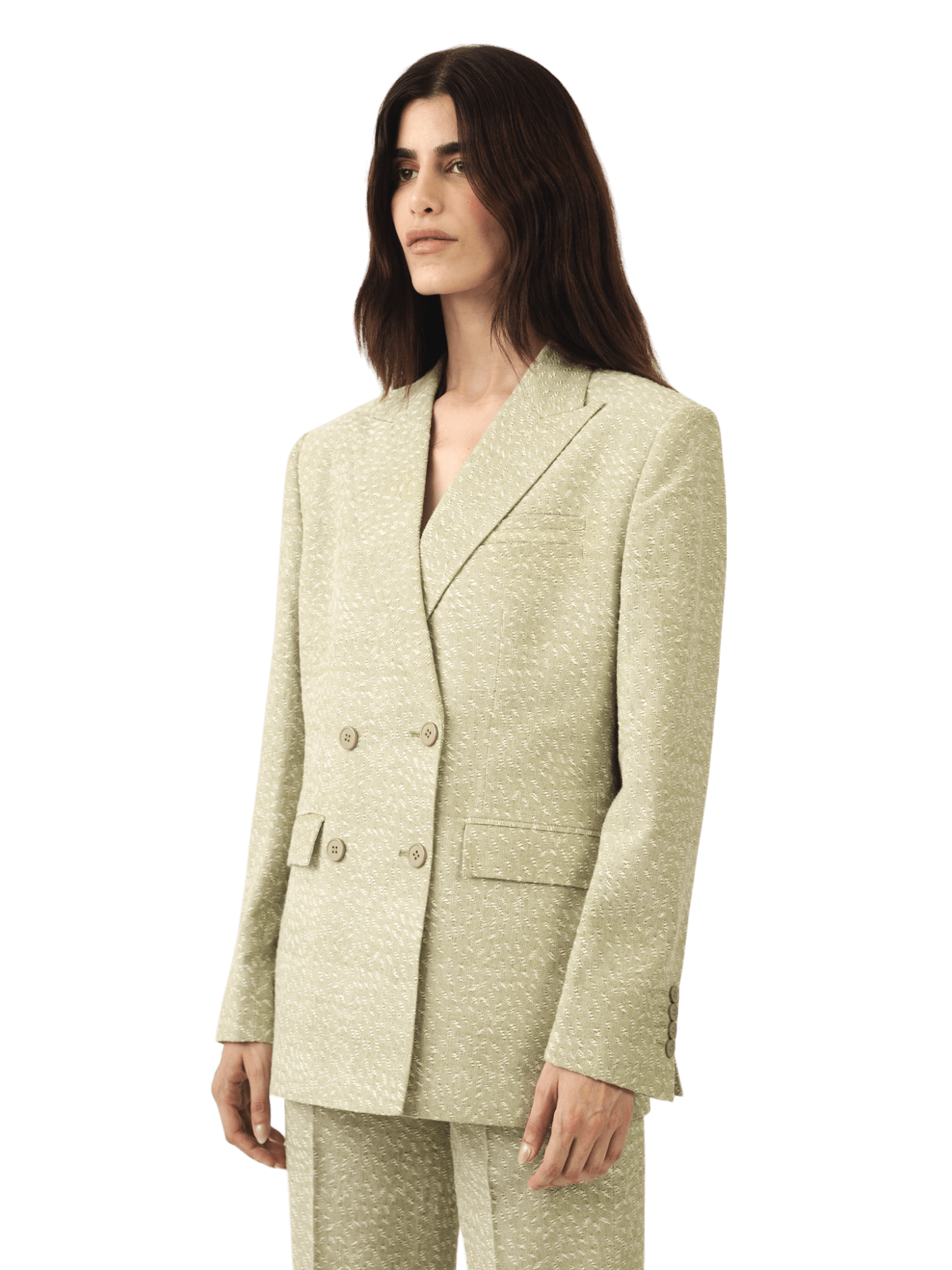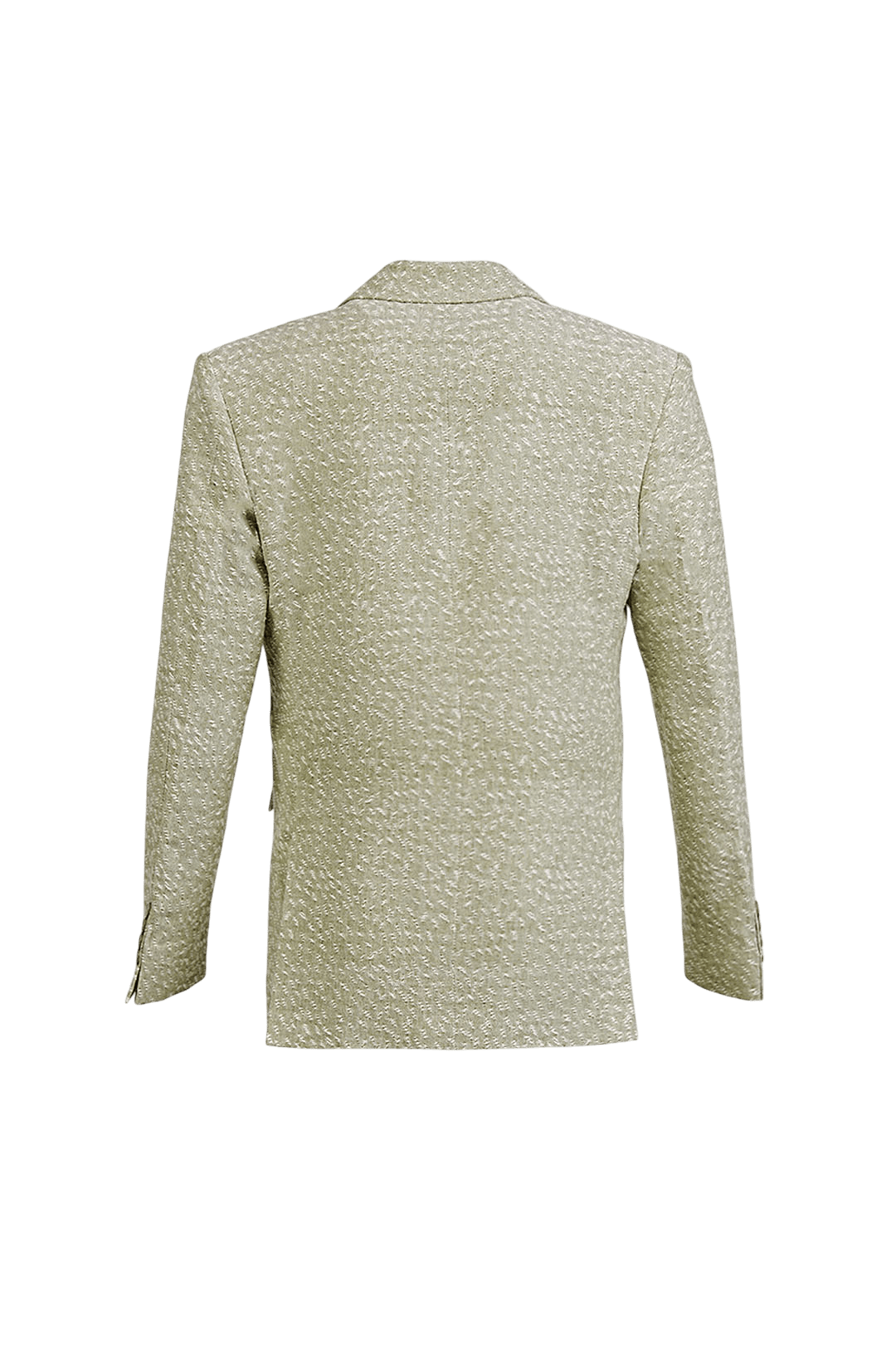 A structured masterpiece in soft sage, this double-breasted blazer is tailored from handwoven khaddi jacquard — combining traditional South Asian loom work with a modern silhouette. The fabric's rich texture and natural slubs echo artisanal heritage, while the sharply cut lapels and four-button front reflect timeless tailoring. Designed to pair effortlessly with the matching trousers or style as a standalone statement piece.