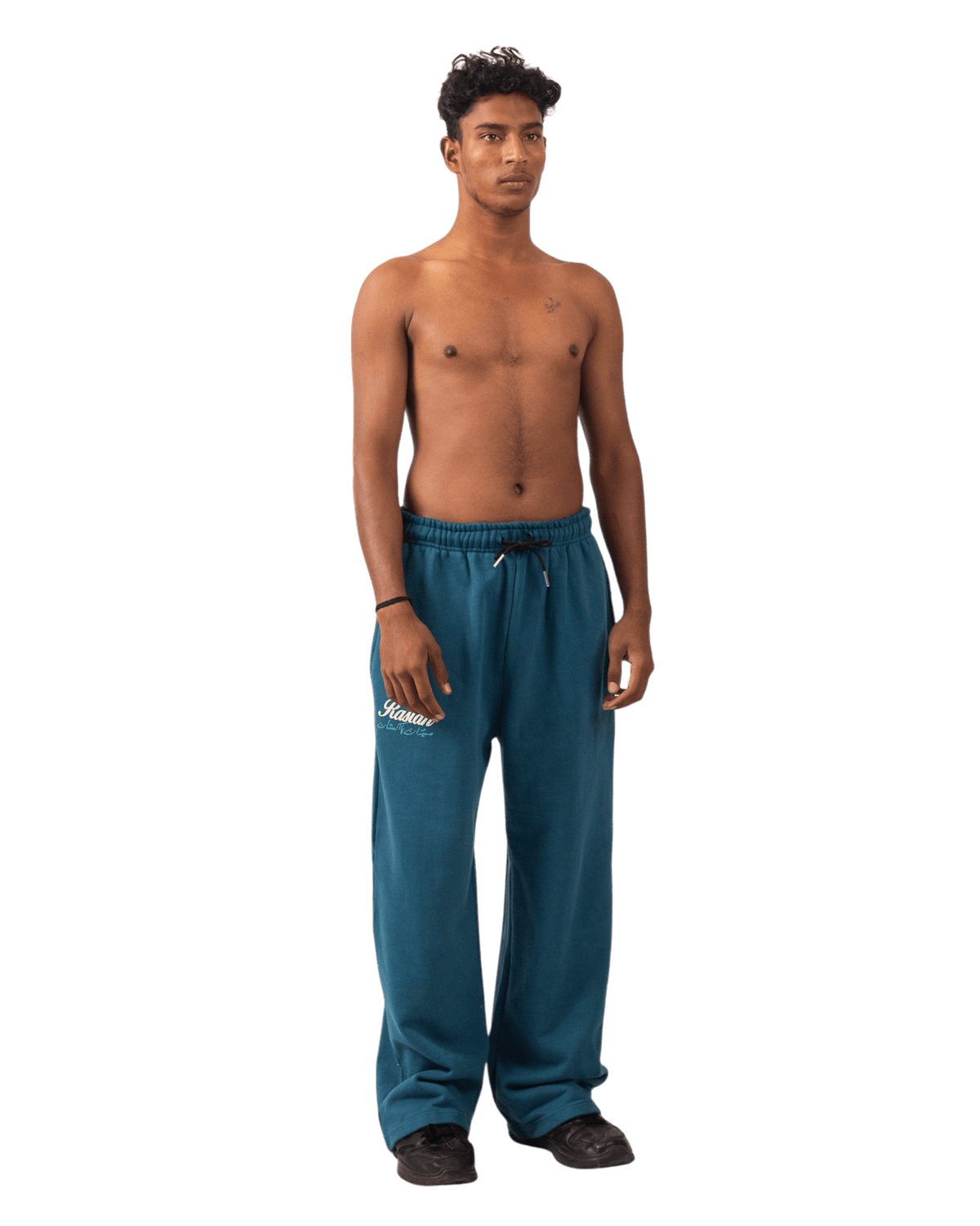 Made from premium heavyweight cotton fleece, these sweatpants are designed to offer warmth, durability, and style. The rich dark cyan hue adds a refined touch, while intricate details like the bold puff-printed "Rastah" logo on the front right pocket and the elegant Urdu "Rastah" logo on the back hemline elevate the design. The addition of a back pocket ensures practicality without compromising on aesthetics.