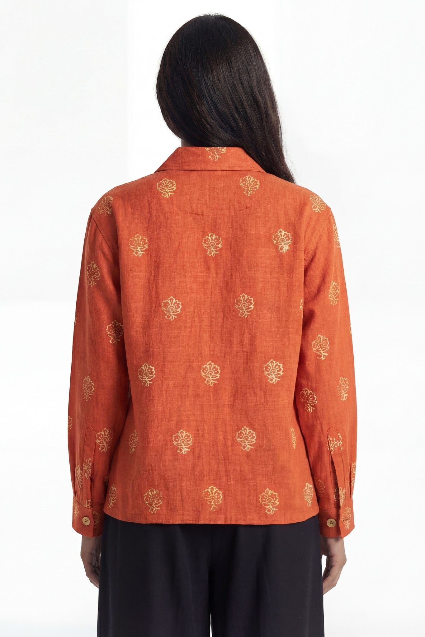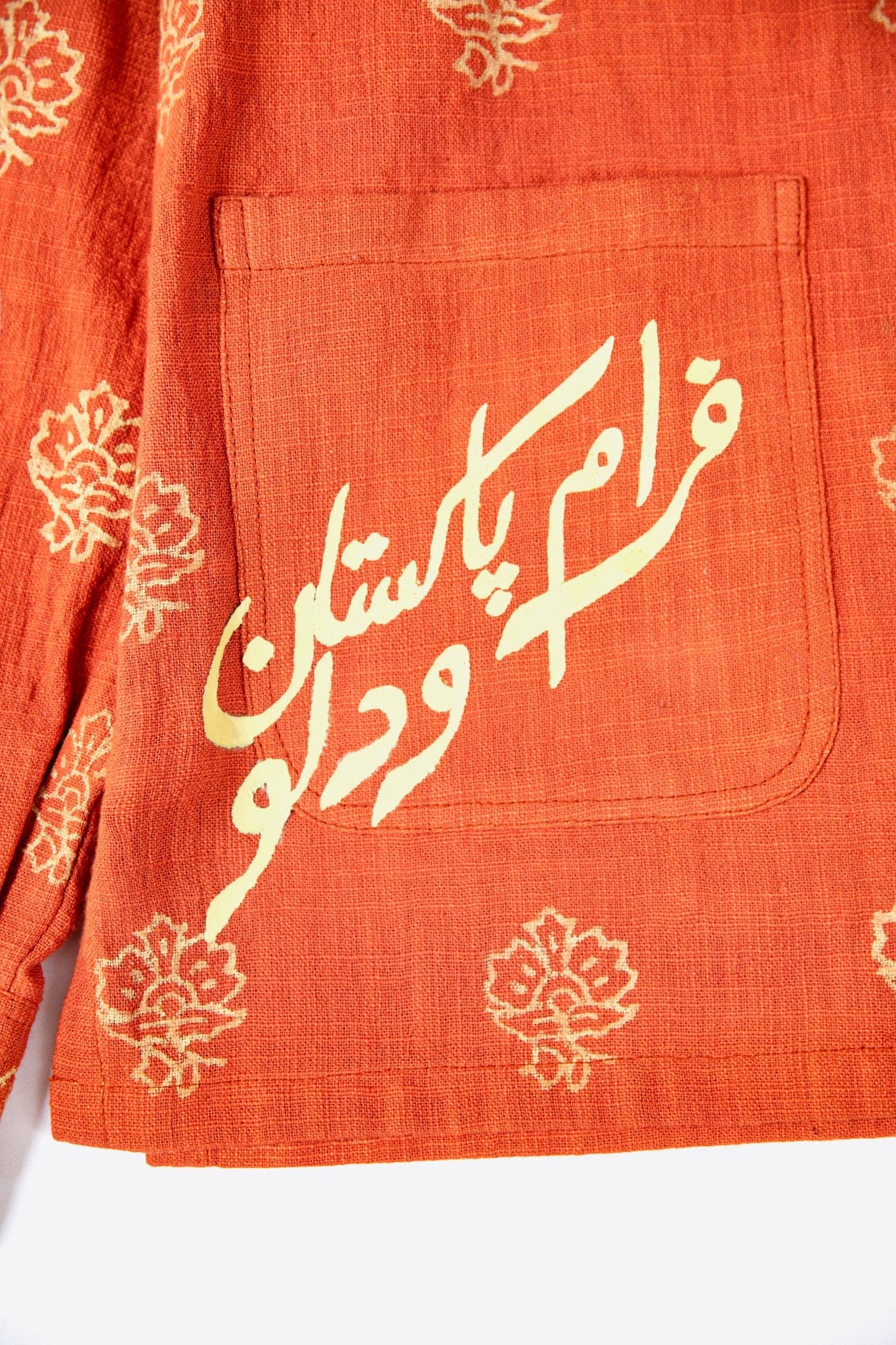 Hand block-printed floral motifs are distributed across the garment, creating rhythmic repetition rooted in South Asian textile traditions. The deep basanti hue enhances the contrast of the cream floral prints, giving the piece a bold yet balanced presence.