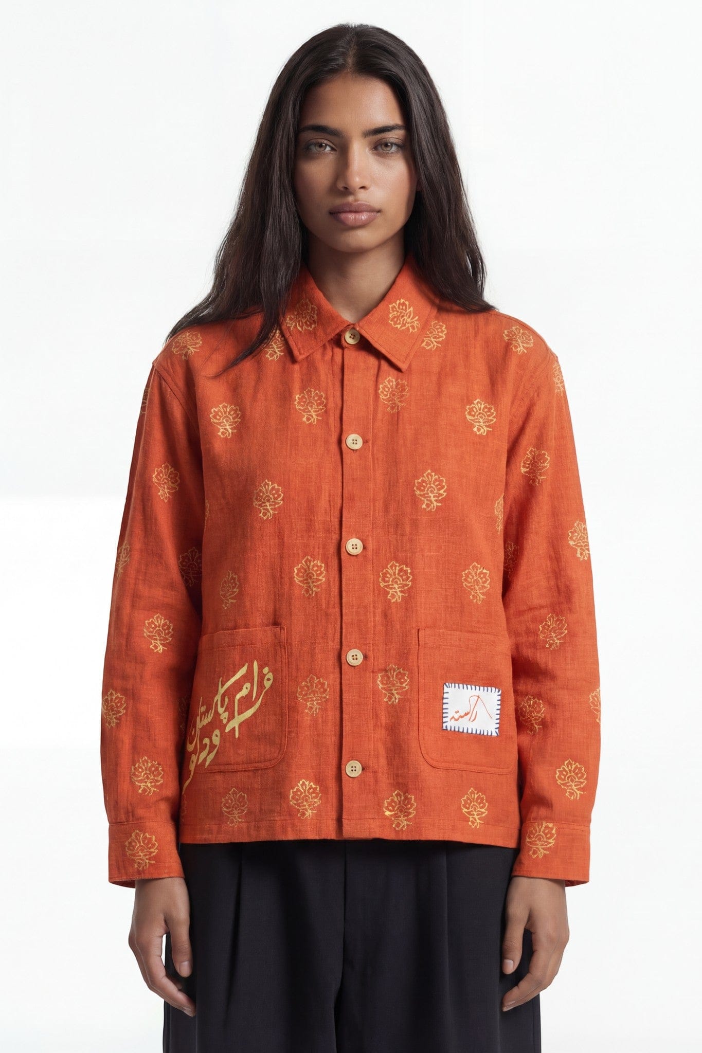 A stitched Rastah patch detail and Urdu graphic placement introduce a contemporary layer to the otherwise heritage-driven design. Designed as a full-sleeve button-down, the silhouette moves effortlessly between cultural occasions and everyday styling.
