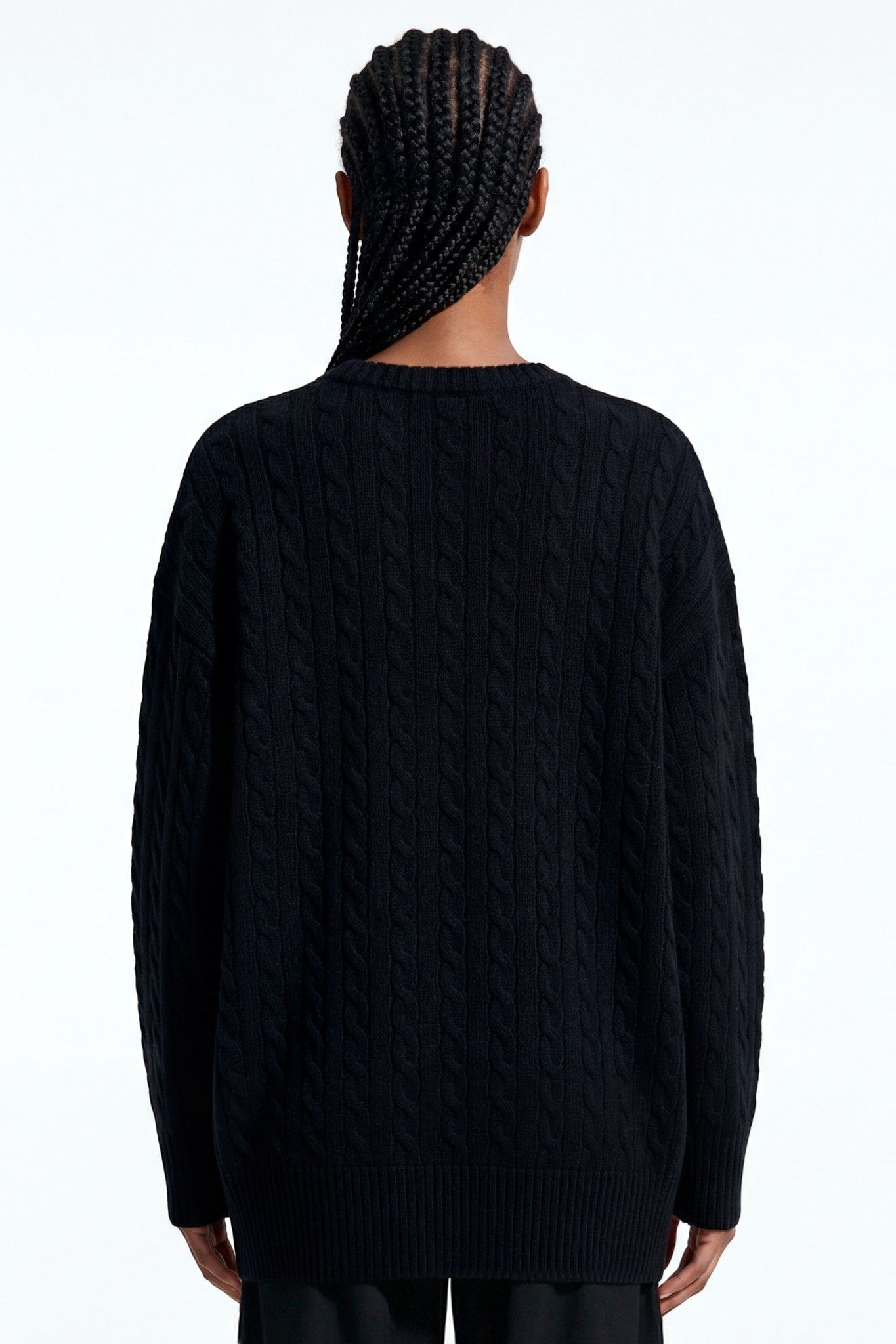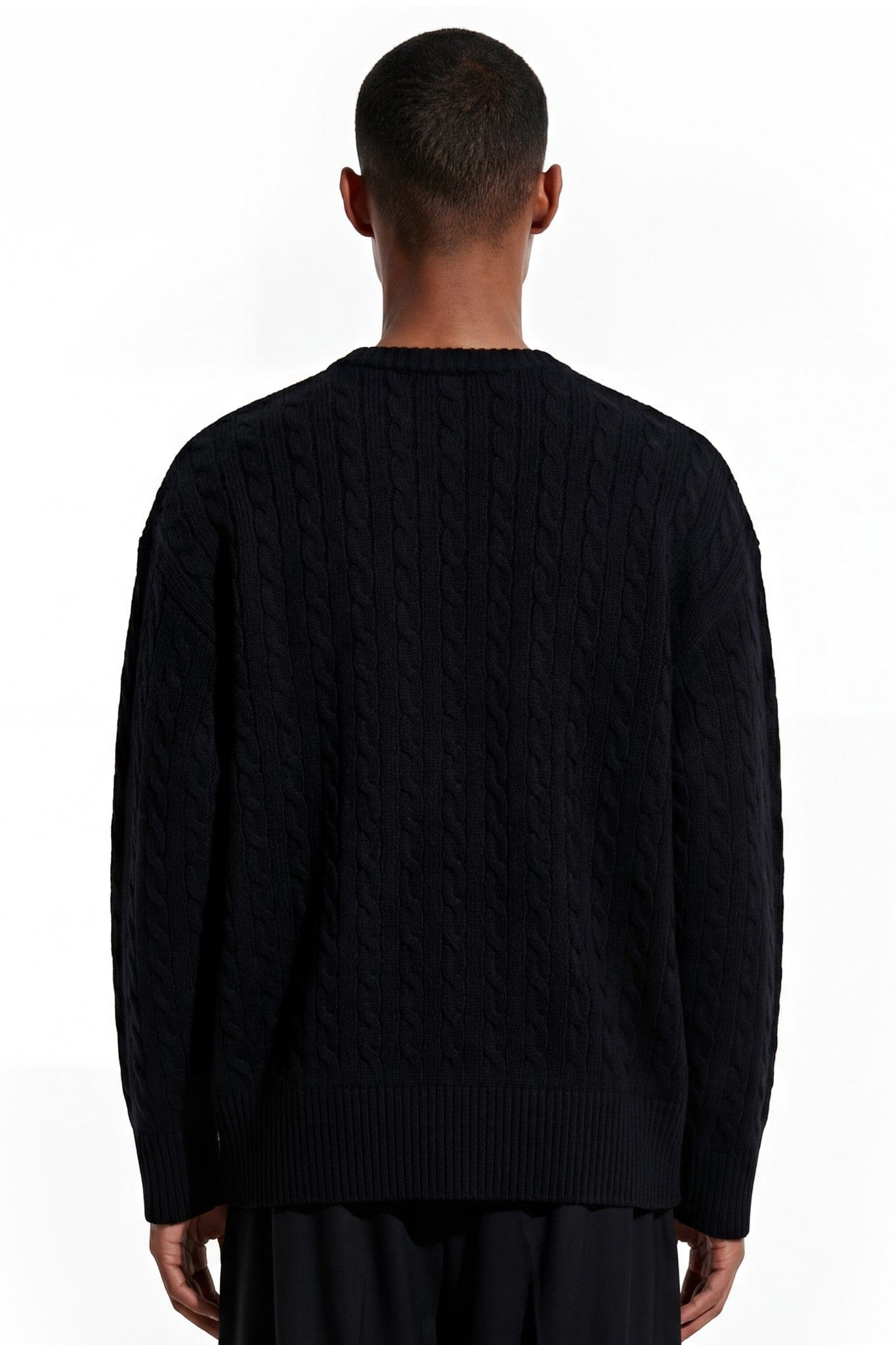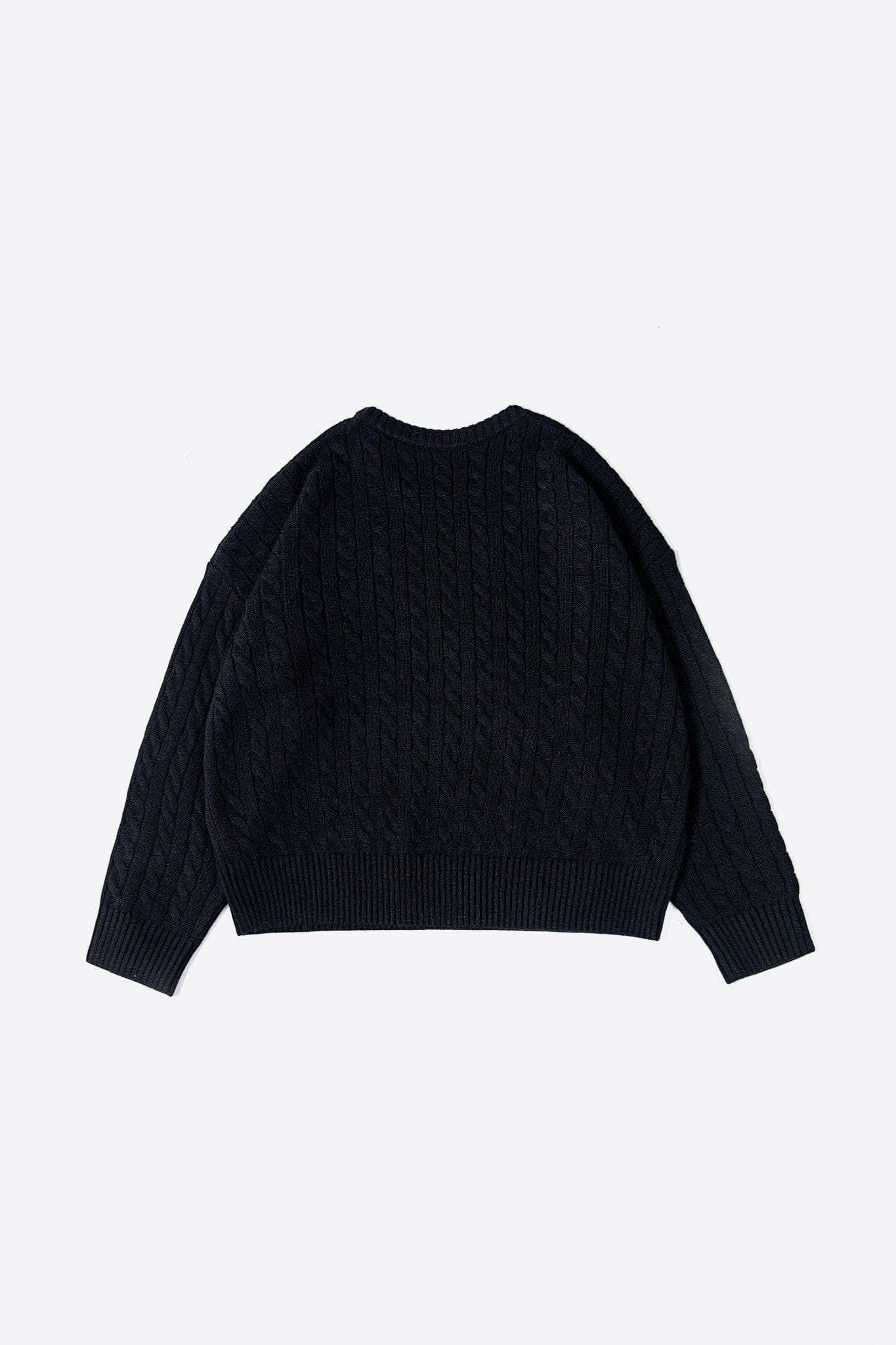The deep black tone allows the raised cable patterns to take center stage, creating quiet depth through texture rather than contrast. Ribbed collar, cuffs, and hem provide balance and durability, keeping the silhouette clean and intentional.