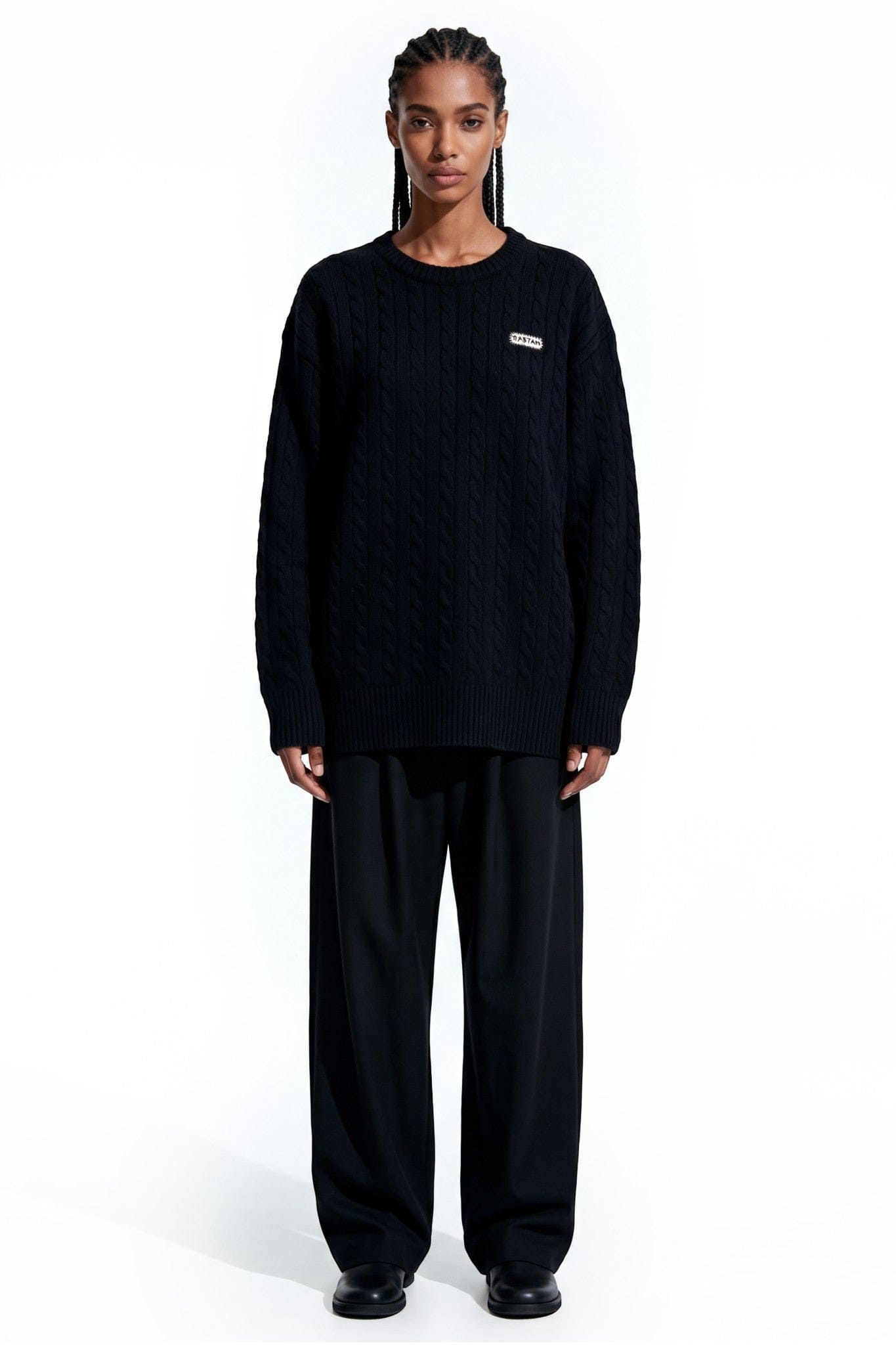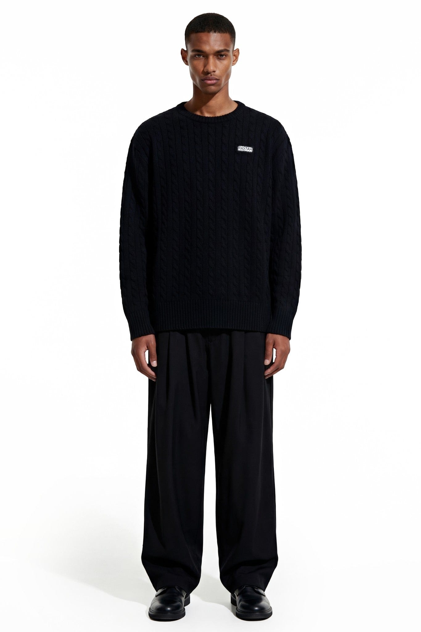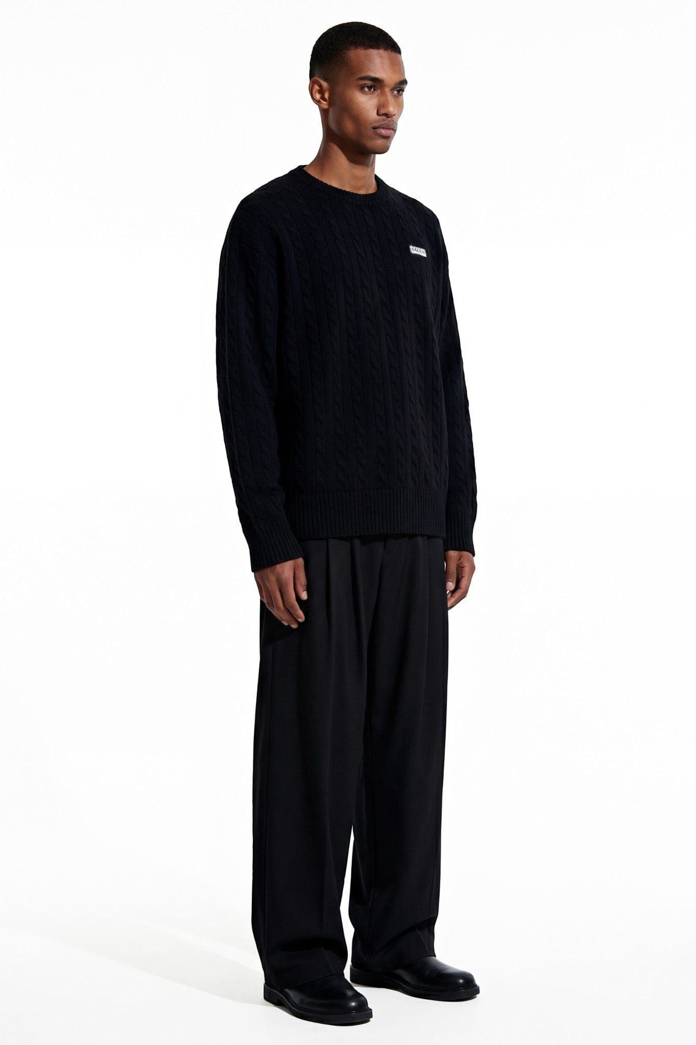 The deep black tone allows the raised cable patterns to take center stage, creating quiet depth through texture rather than contrast. Ribbed collar, cuffs, and hem provide balance and durability, keeping the silhouette clean and intentional.