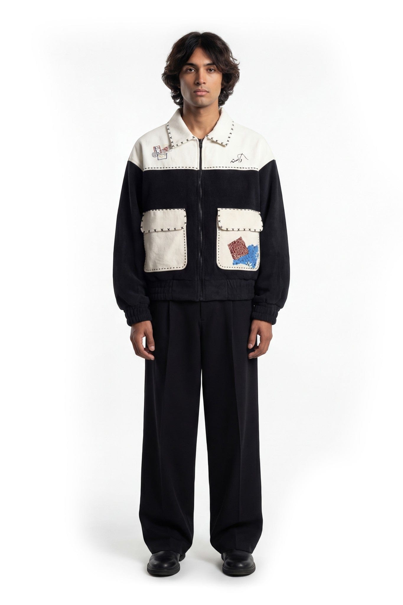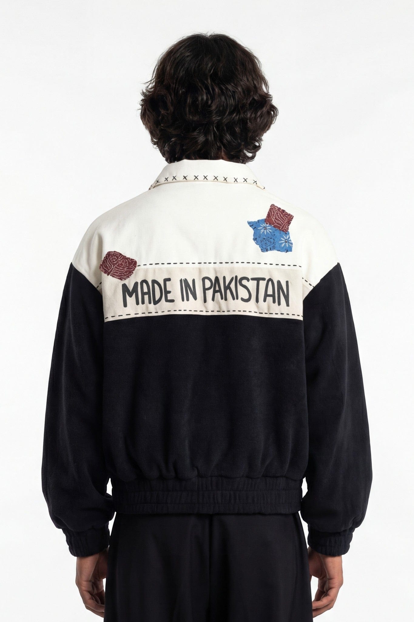 The Made in Pakistan Bomber Jacket is a bold expression of craft, culture, and construction. Built in a structured bomber silhouette, this piece combines sherpa-textured paneling with denim contrast for a layered, utility-driven look.