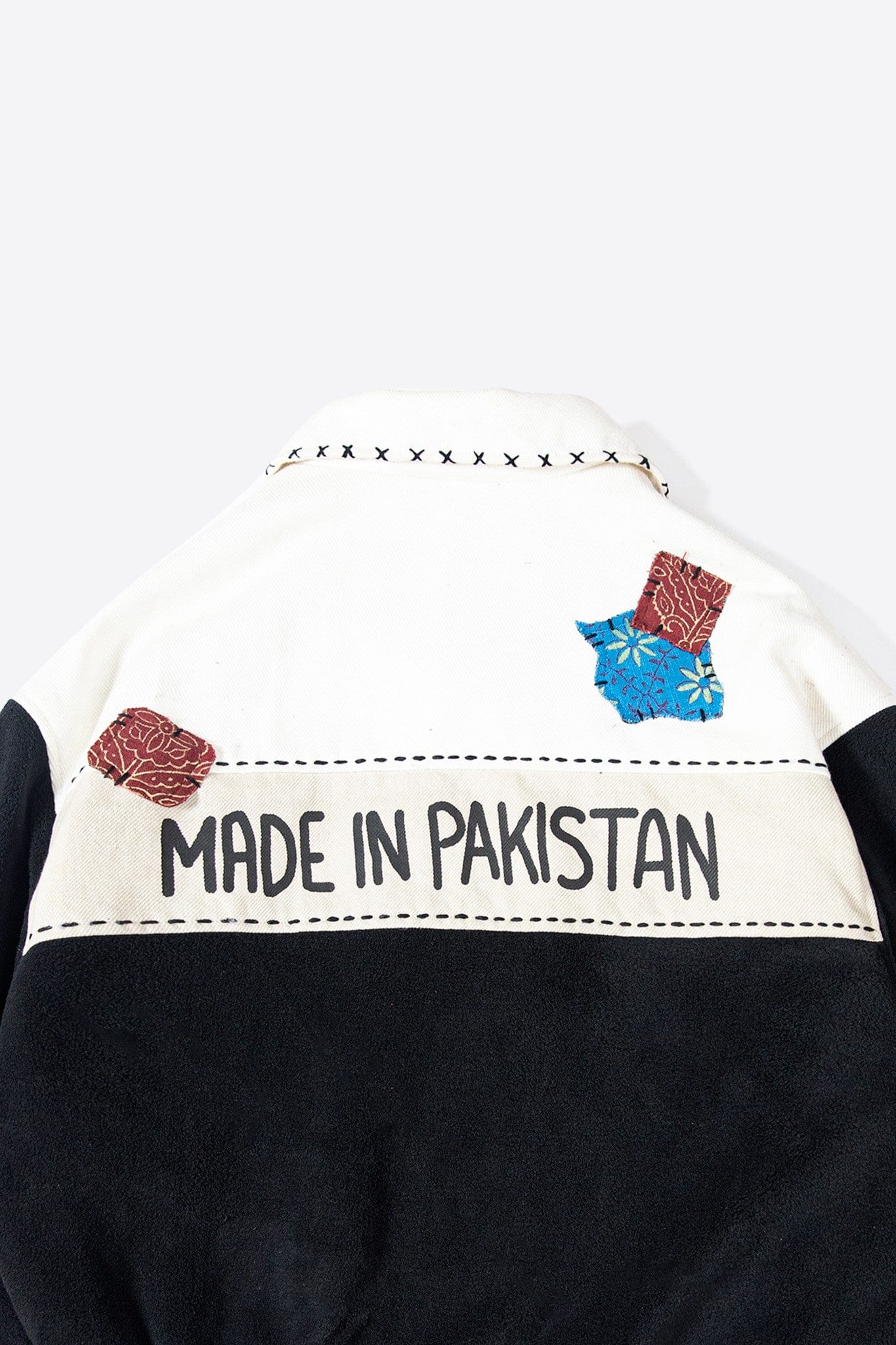 The front features oversized flap pockets detailed with hand-style fashion stitches and ajrak patch inserts, giving it a raw, workshop aesthetic. Embroidered detailing and subtle screen print elements elevate the upper chest area, while the back makes a strong statement with large-scale “Made in Pakistan” typography — unapologetic and direct.