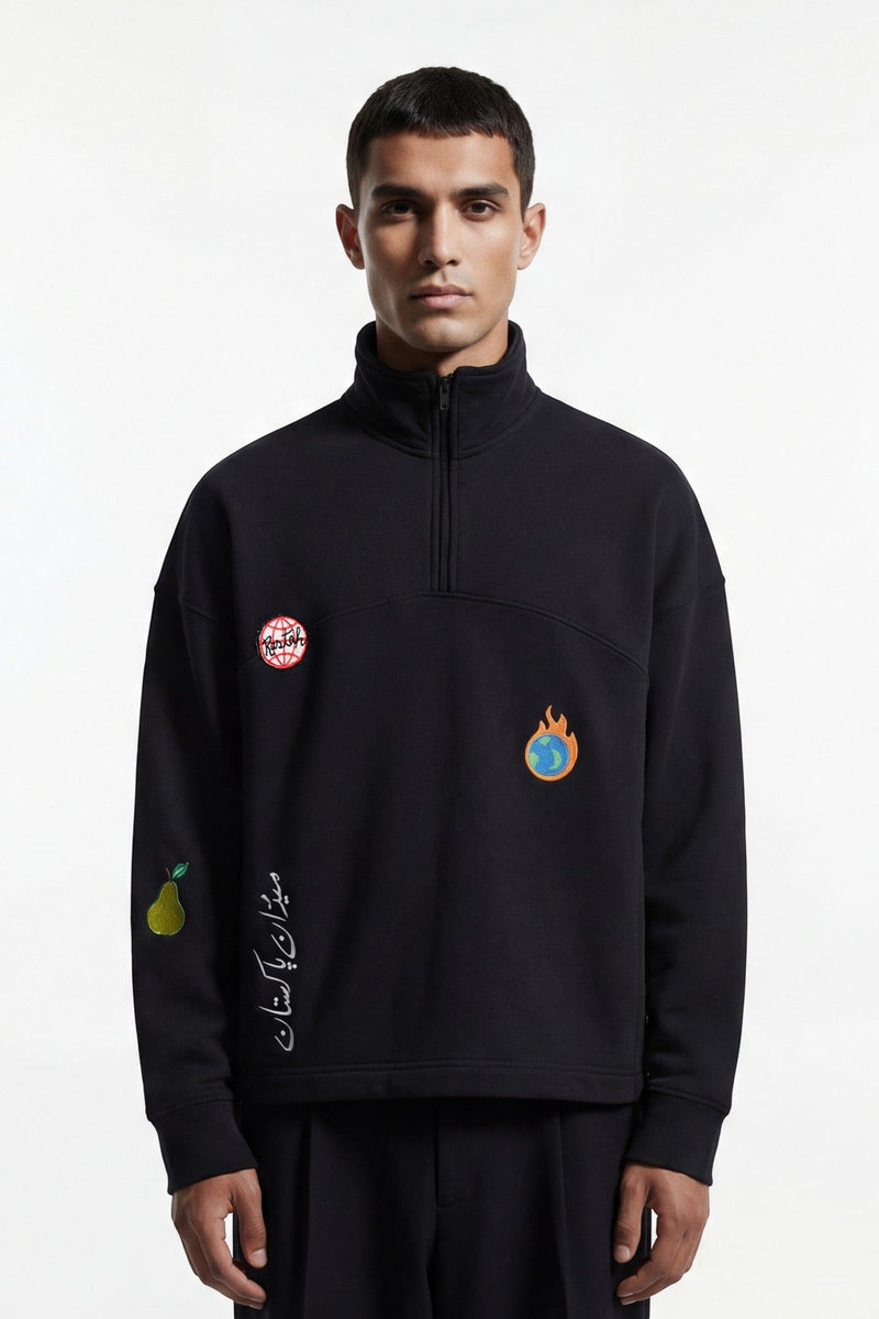 Crafted from 100% cotton fleece, the Sab Ka Rasta Sweatshirt blends cultural narrative with contemporary streetwear energy. The black base acts as a bold canvas for expressive screen-printed Urdu typography across the back, paired with symbolic graphics including crescent motifs, global iconography, and Rastah’s signature detailing.