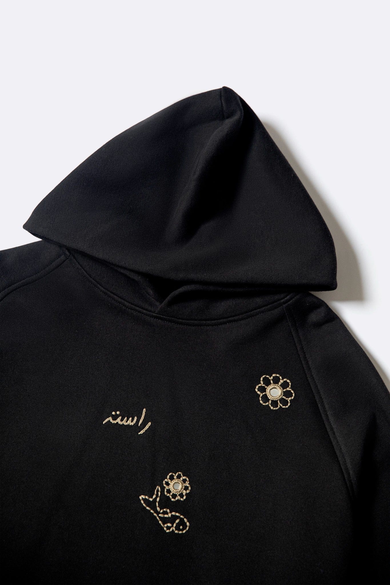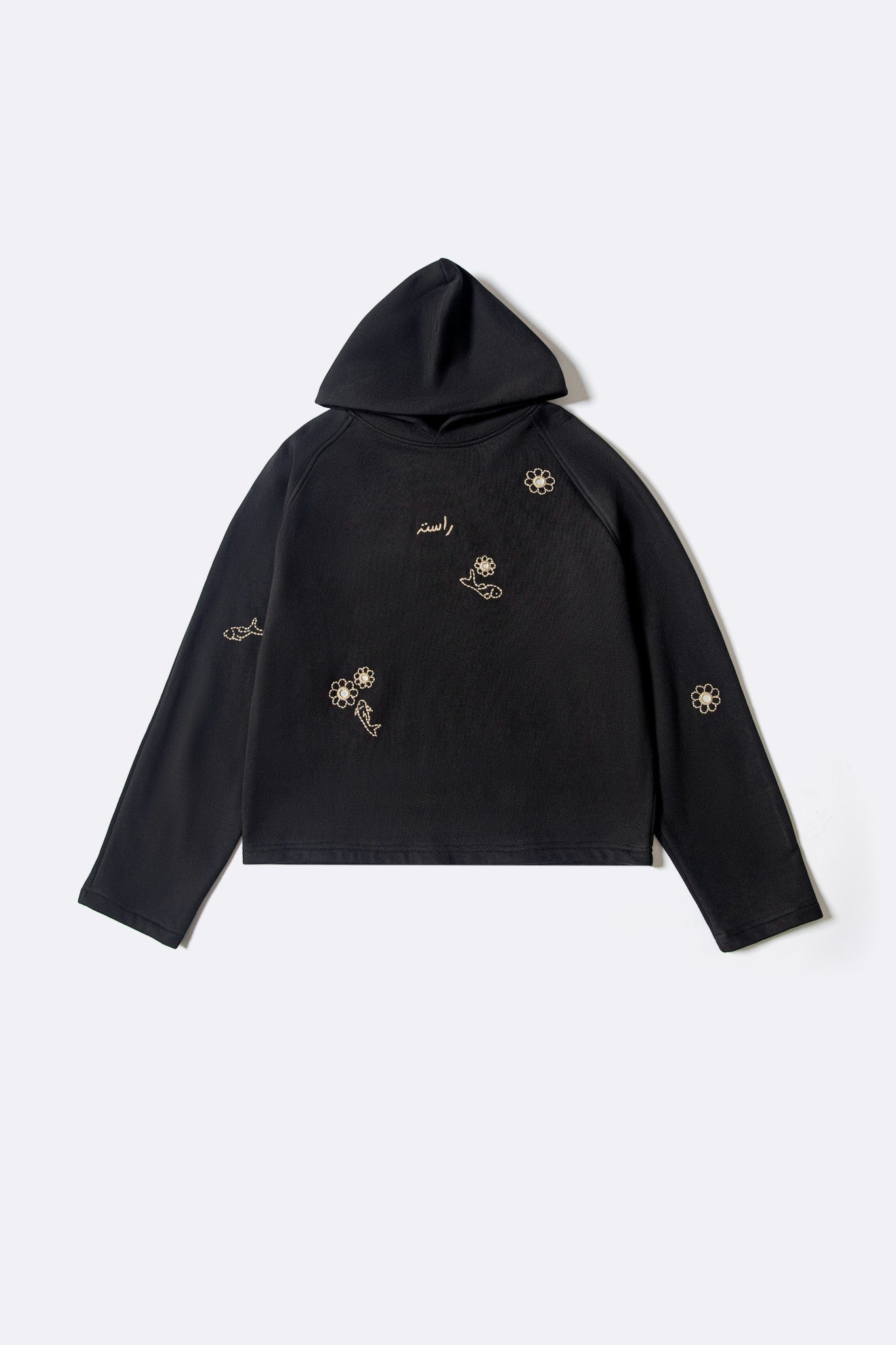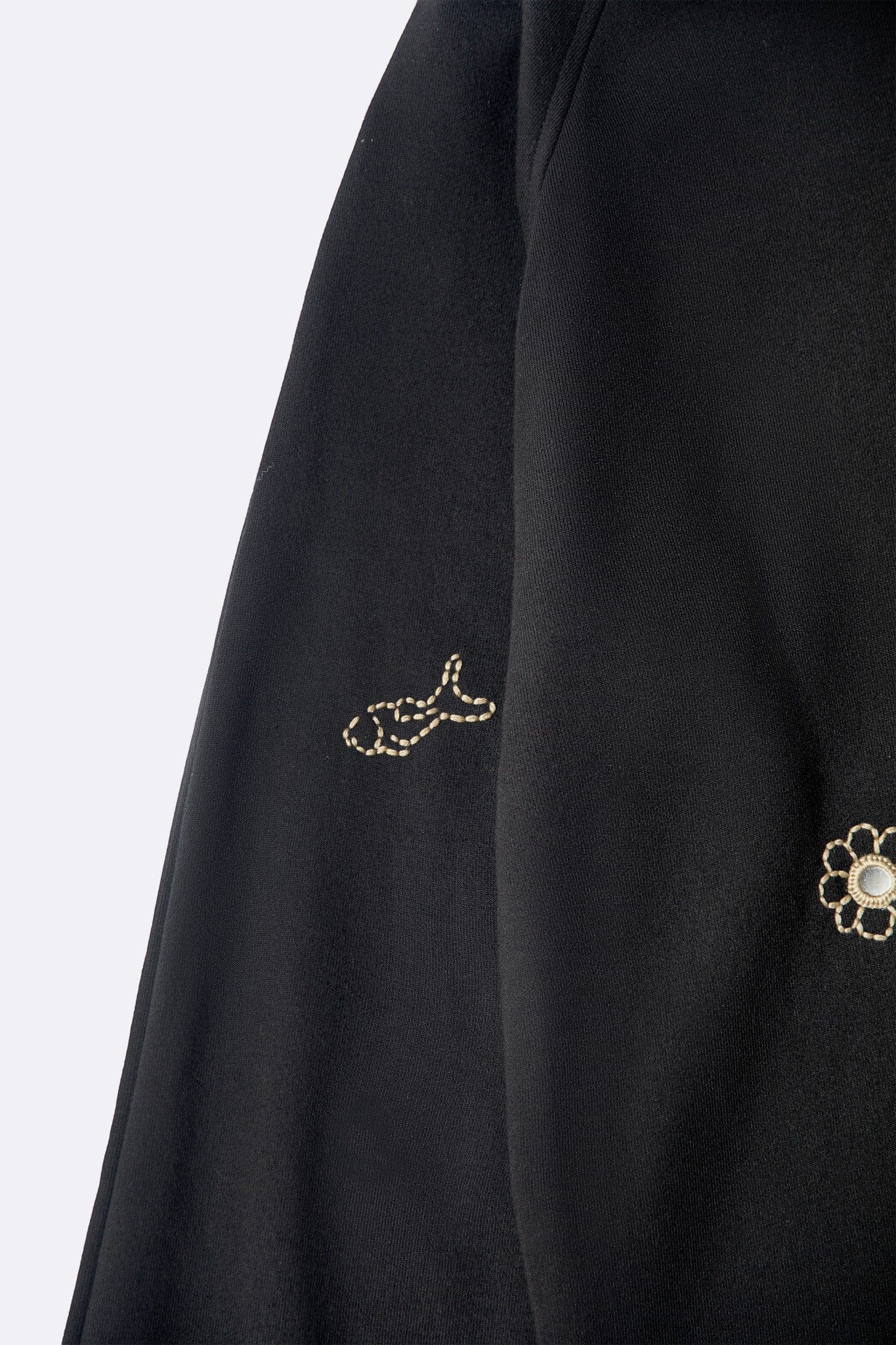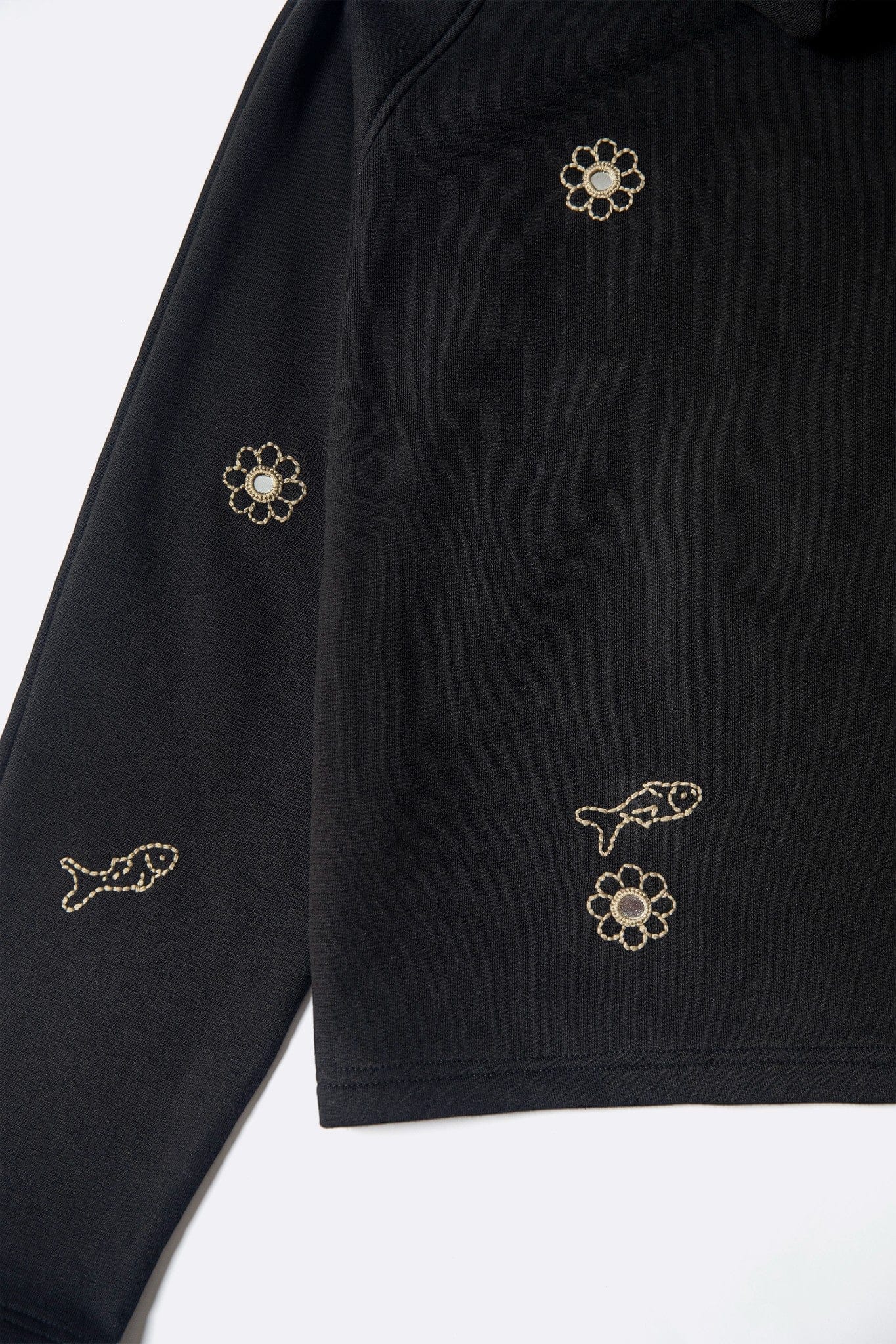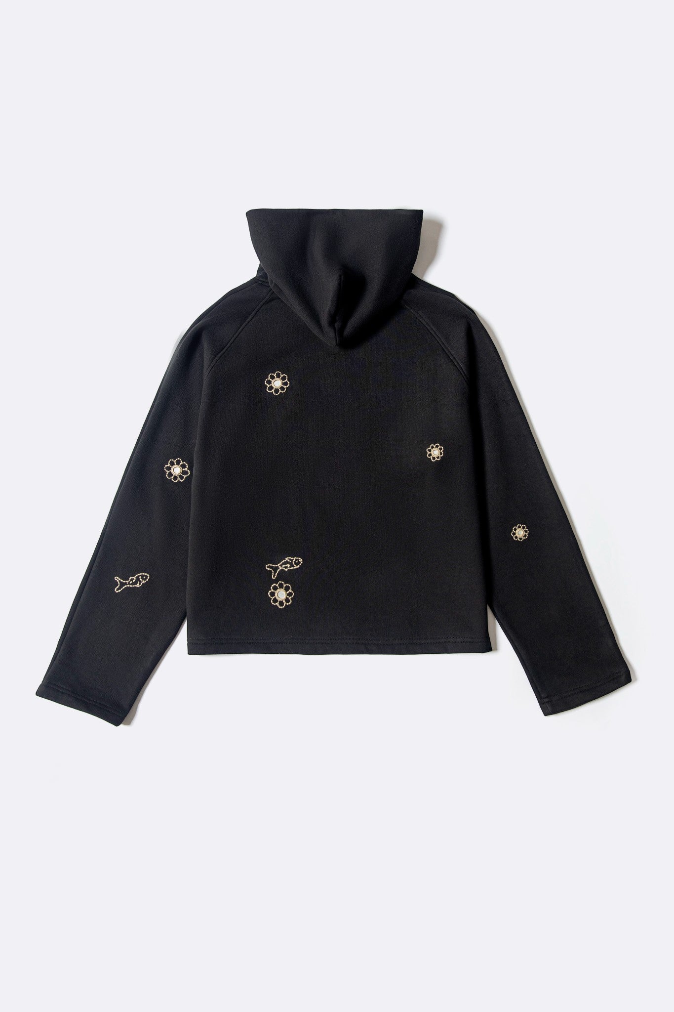 A relaxed-fit hoodie crafted from 100% cotton, 400 GSM heavyweight fabric, featuring all-over hand embroidery with fish and floral motifs accented by mirror work. The reflective elements interrupt clarity rather than reveal it, drawing from a Tutinama tale where reflection is deliberately withheld.