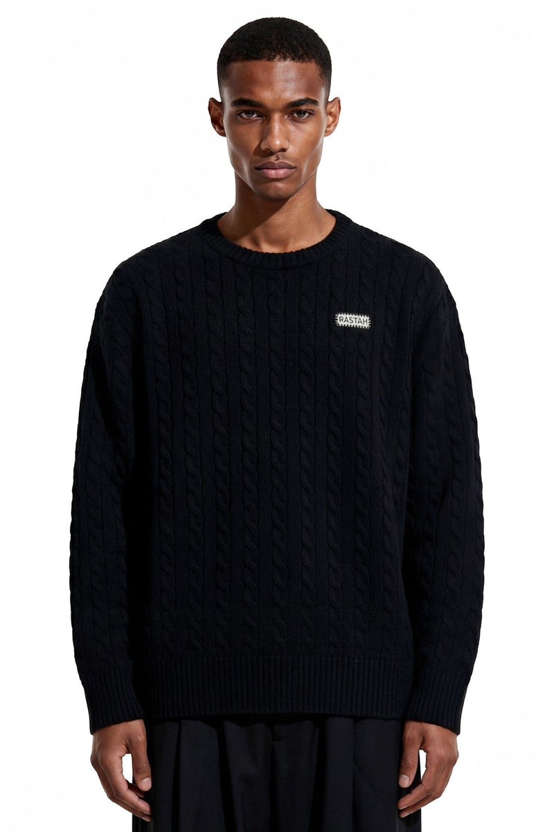 The deep black tone allows the raised cable patterns to take center stage, creating quiet depth through texture rather than contrast. Ribbed collar, cuffs, and hem provide balance and durability, keeping the silhouette clean and intentional.