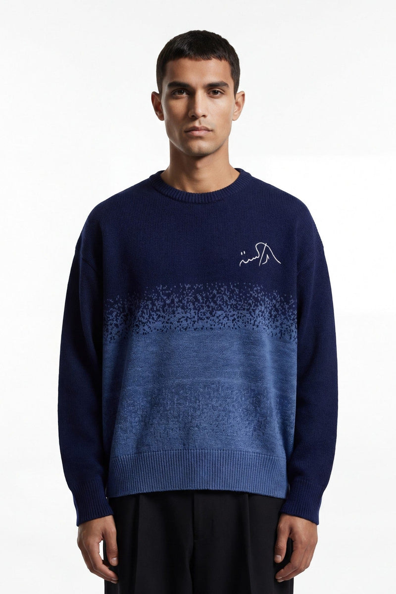 This sweater is built around transition—where one shade softens into another, and nothing feels abrupt. Crafted in a smooth knit with a subtle gradient finish, the color fades from deep blue into lighter tones, creating depth without distraction.
