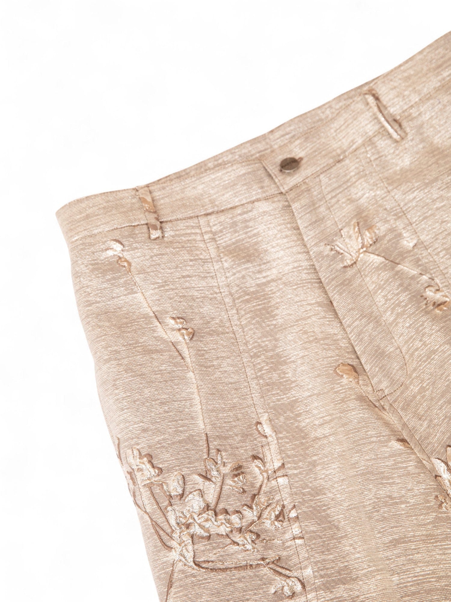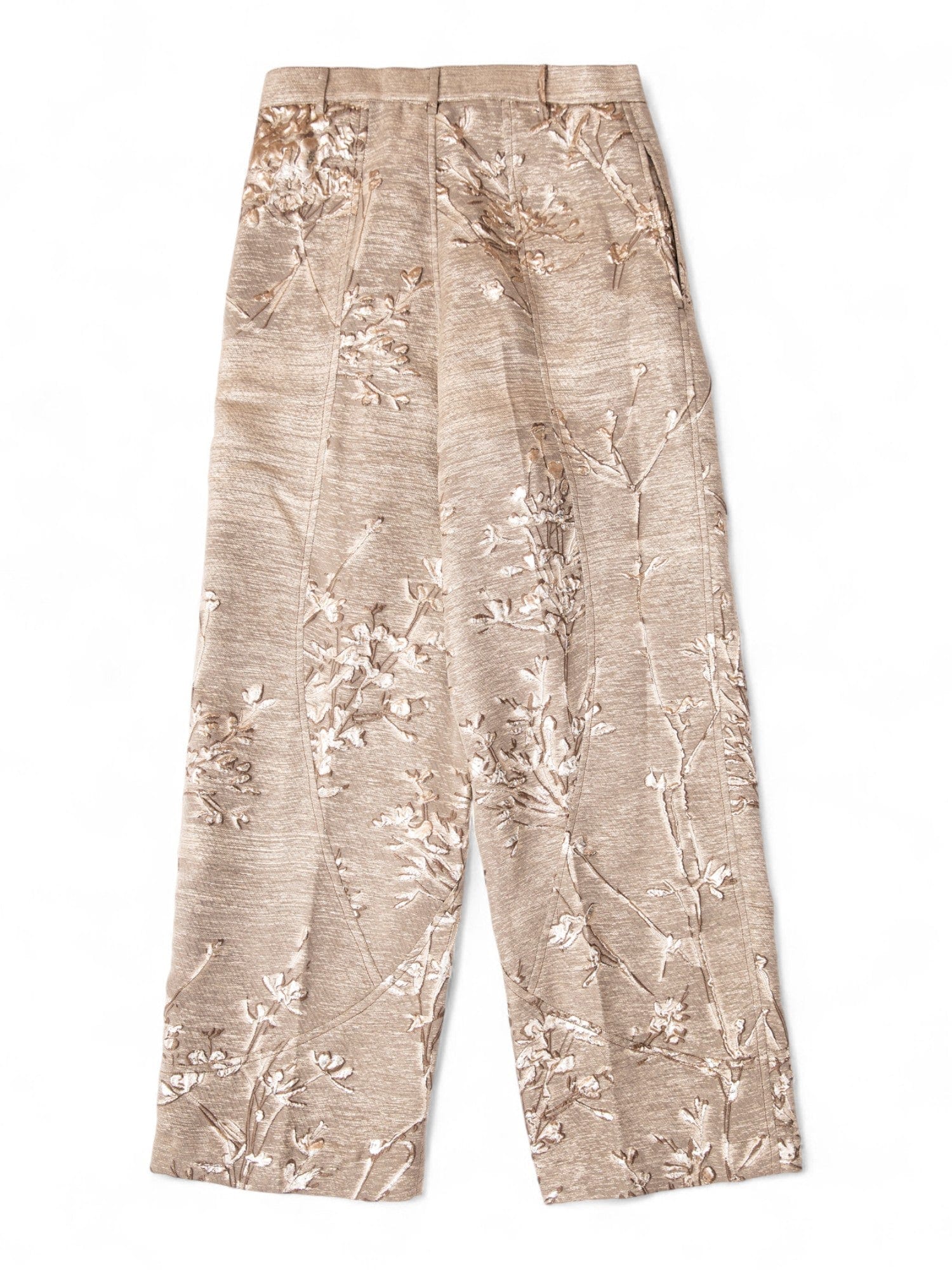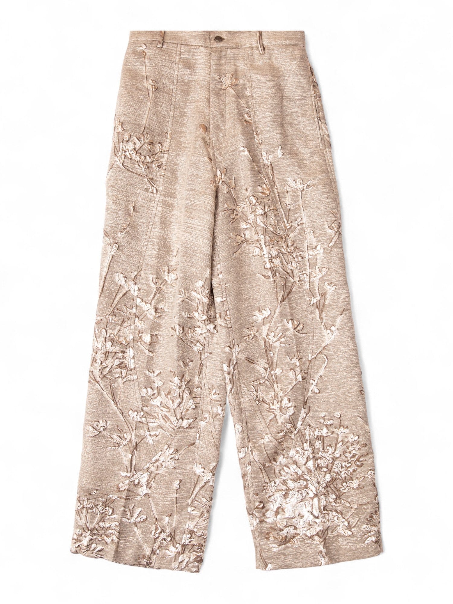 These pants are tailored from luxurious Italian fabric featuring a dull silver floral embossing that catches the light with every movement. The soft sheen and intricate texture elevate the minimalist silhouette, offering a blend of sophistication and understated opulence.