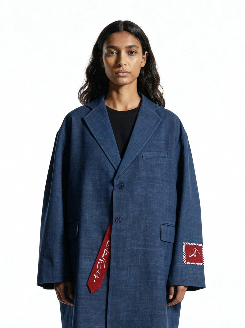 Crafted from textured blue suiting fabric, it features a relaxed drop-shoulder silhouette and a classic notch lapel collar. A bold red hanging tab printed with Urdu text and a matching logo patch on the sleeve add a refined cultural touch. Finished with a hand-stitched border and dual vents at the back, this coat reimagines classic menswear through a lens of storytelling and craftsmanship.