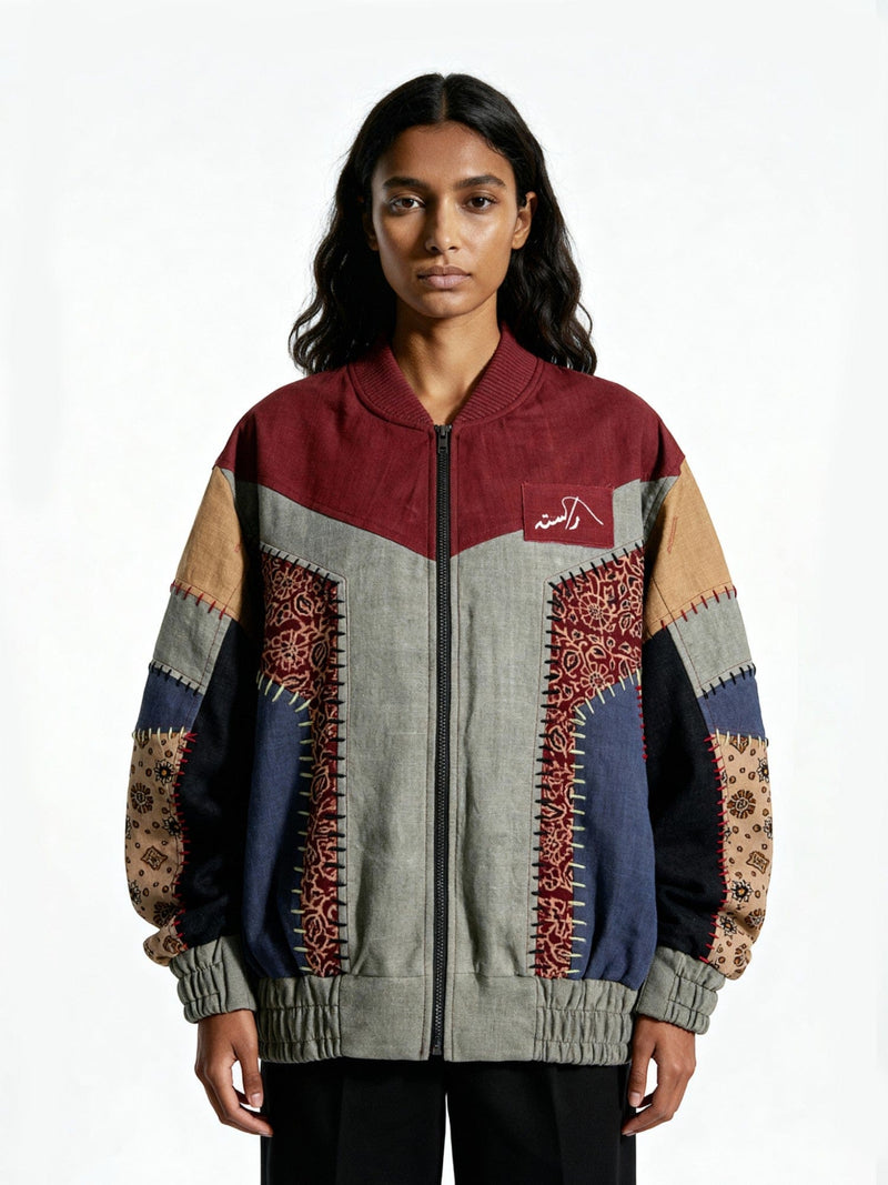 Constructed from handwoven khaddar and hand-printed ajrak fabrics, each panel is uniquely composed, celebrating the rawness of traditional textile art. The jacket features visible fashion stitches tracing the seams—every mark intentional, every imperfection part of its identity. A screen-printed Rastah logo patch completes the front, merging the language of streetwear with centuries-old craft.