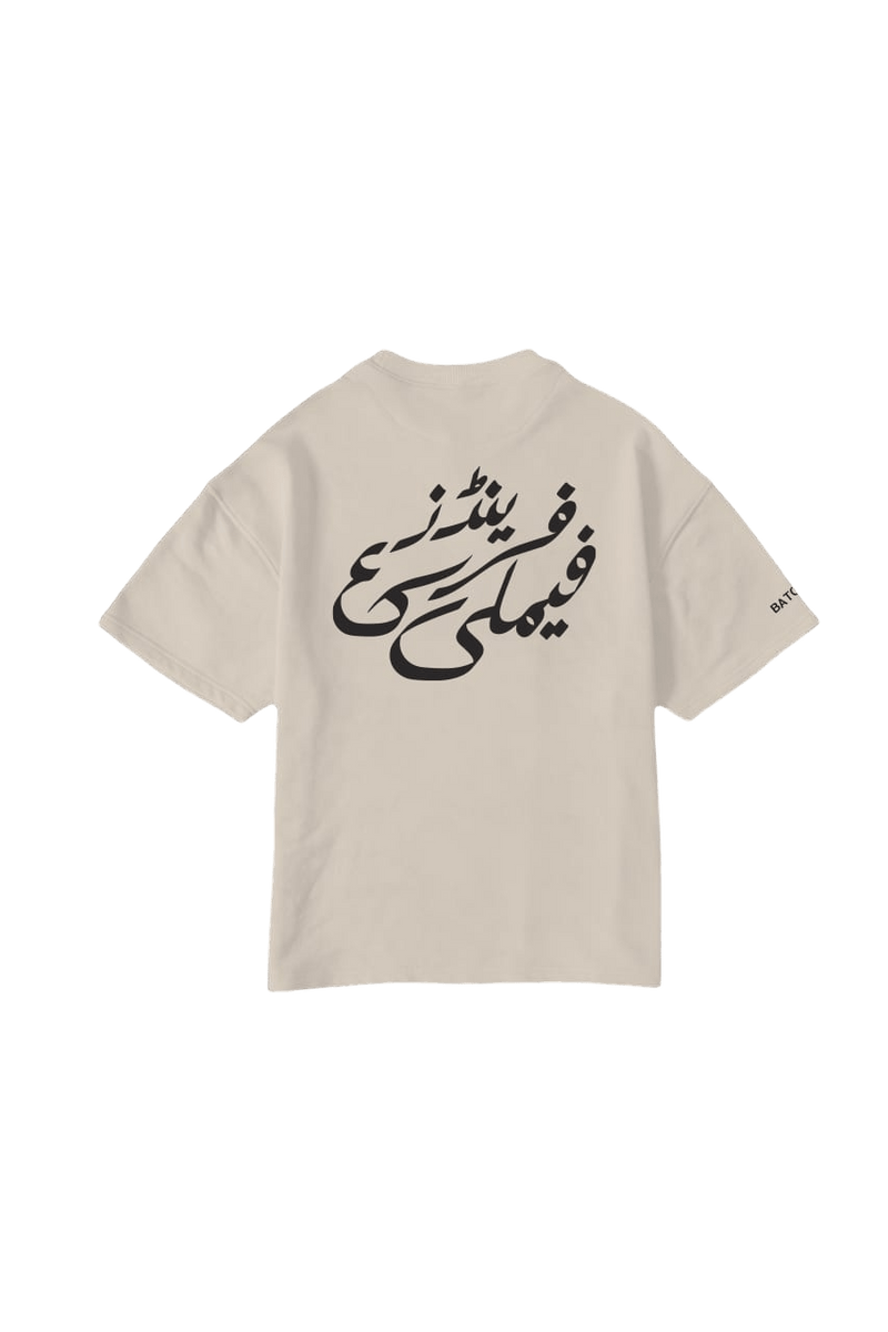 The back of the shirt features elegant Urdu typography that reads "Friends and Family," symbolizing the bond shared with our loyal customers. On the sleeve, you'll find the distinctive "BATCH-02" designation, marking this as the inaugural release of the Rastah Friends and Family collection.