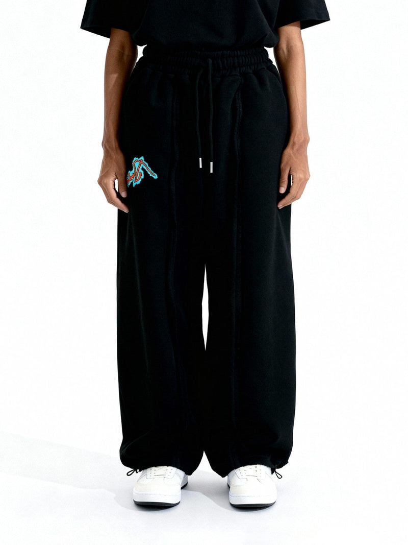 Made from soft fleece, they feature a double frontal seam that elongates the silhouette, paired with a vibrant screen-printed Rastah logo that adds a subtle contrast. Designed with an elasticated waistband and adjustable drawcord, these pants balance relaxed fit with refined streetwear sensibility.