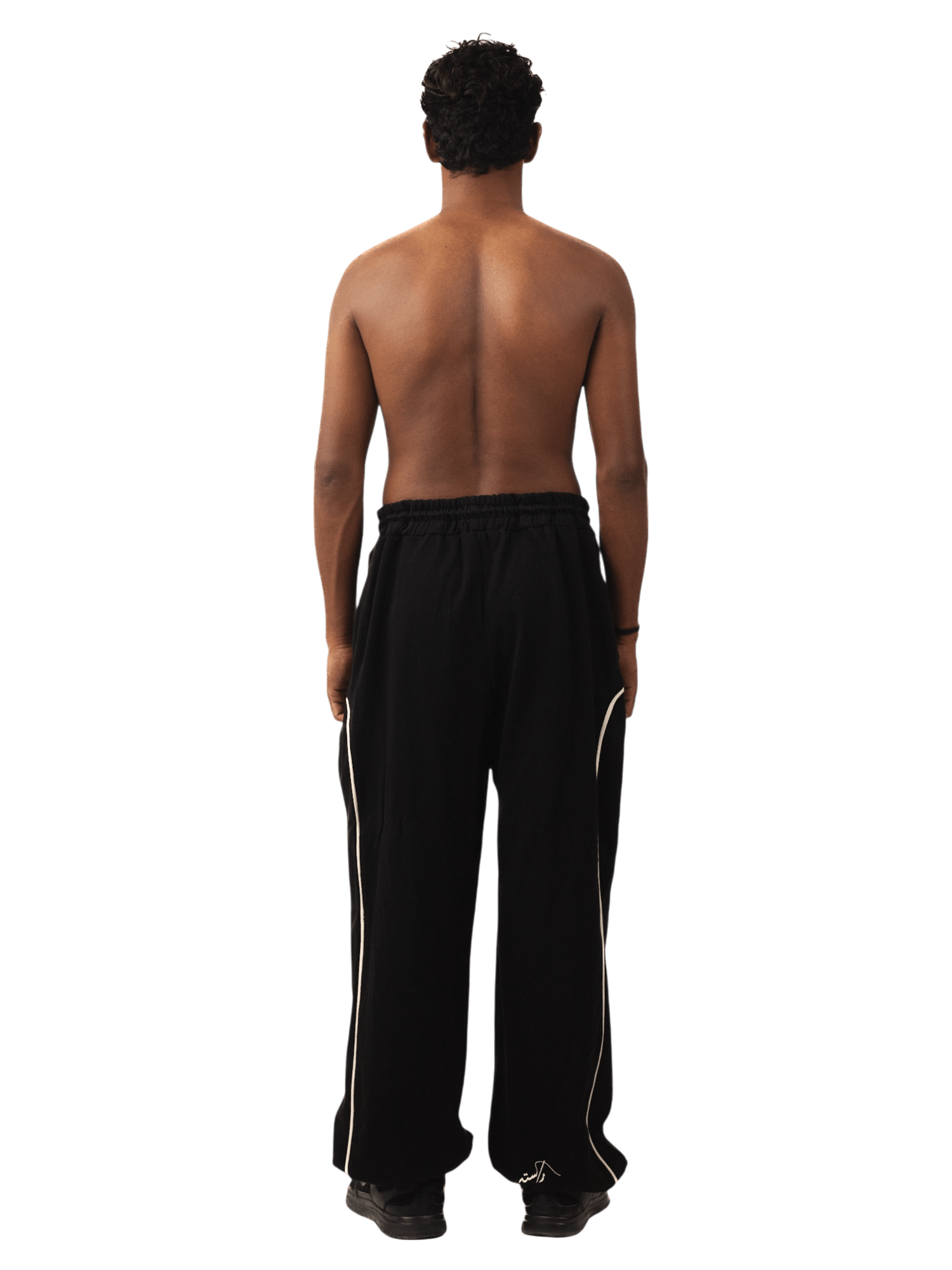 Crafted from soft black terry fabric, these relaxed-fit trousers feature an arched off-white stripe along the side seams, evoking a sense of movement and graphic minimalism. With a drawstring waist and wide-leg silhouette, they blend utility and sport, built for both flow and comfort.