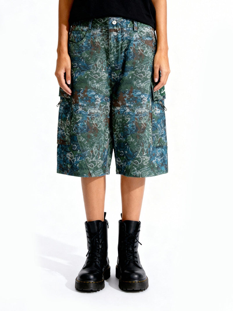 Constructed from printed polyester canvas, the shorts feature an all-over distressed-style pattern in earthy tones of green, blue, and rust. The panelled construction enhances form and structure, while side flap pockets and zip detailing balance functionality with visual depth. Finished with a screen-printed logo patch, this piece stands at the intersection of craft, culture, and contemporary design.