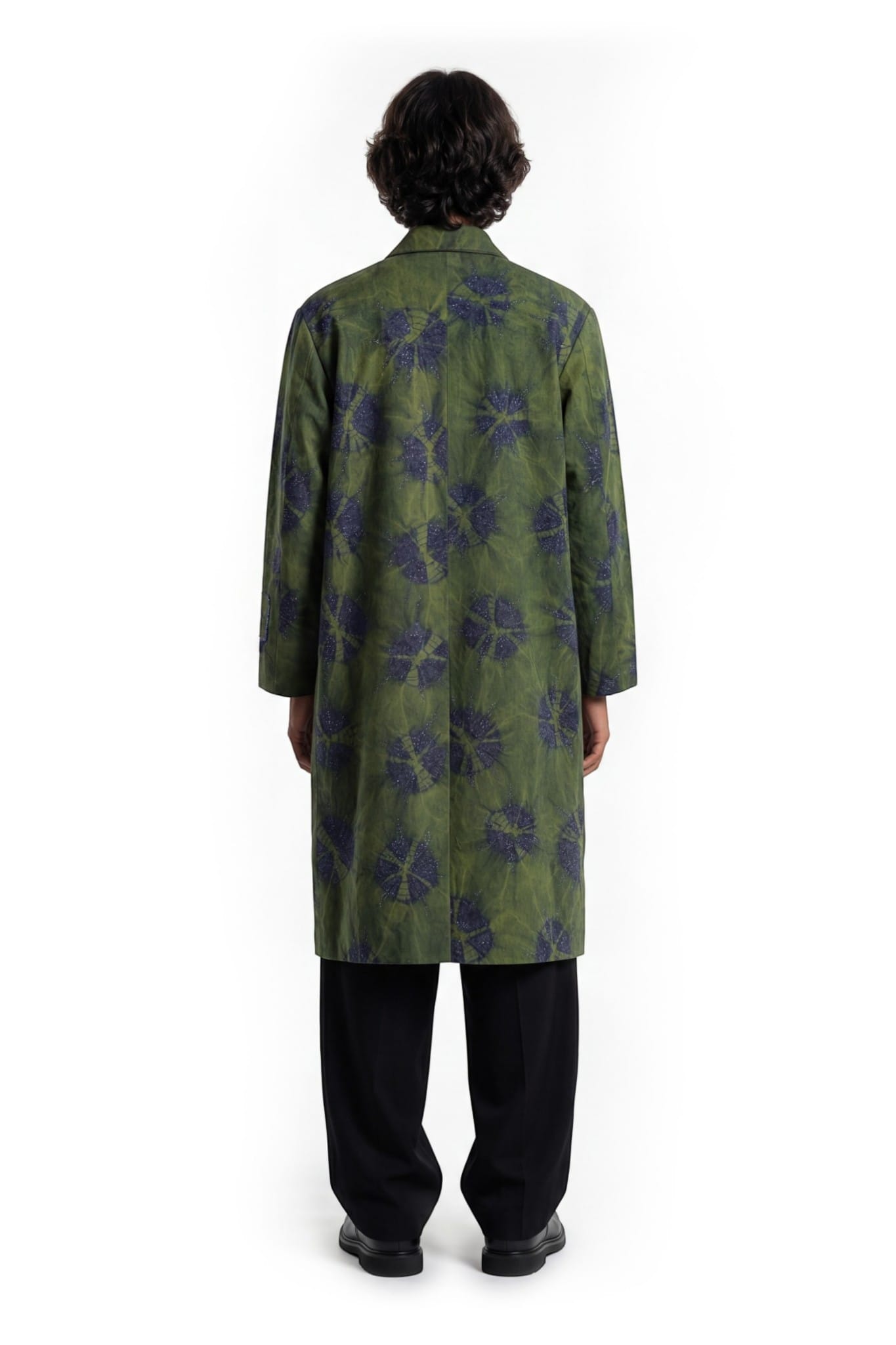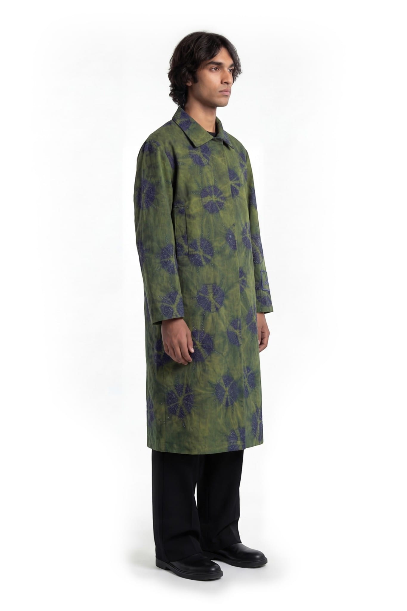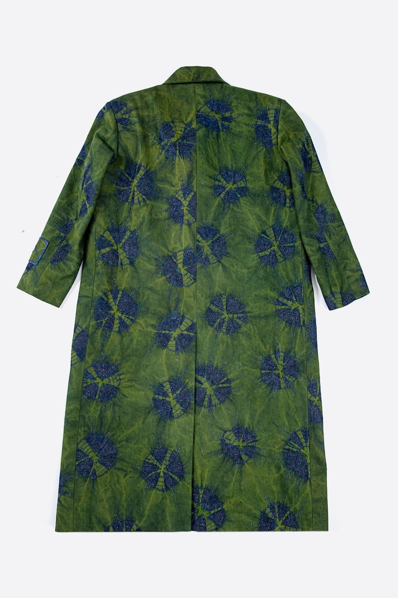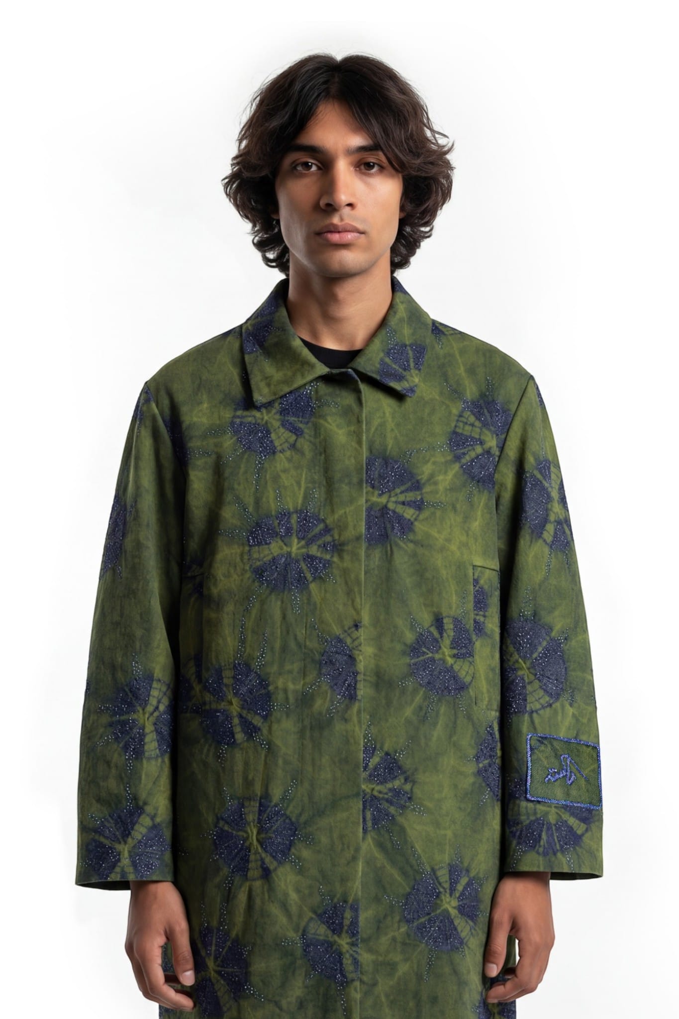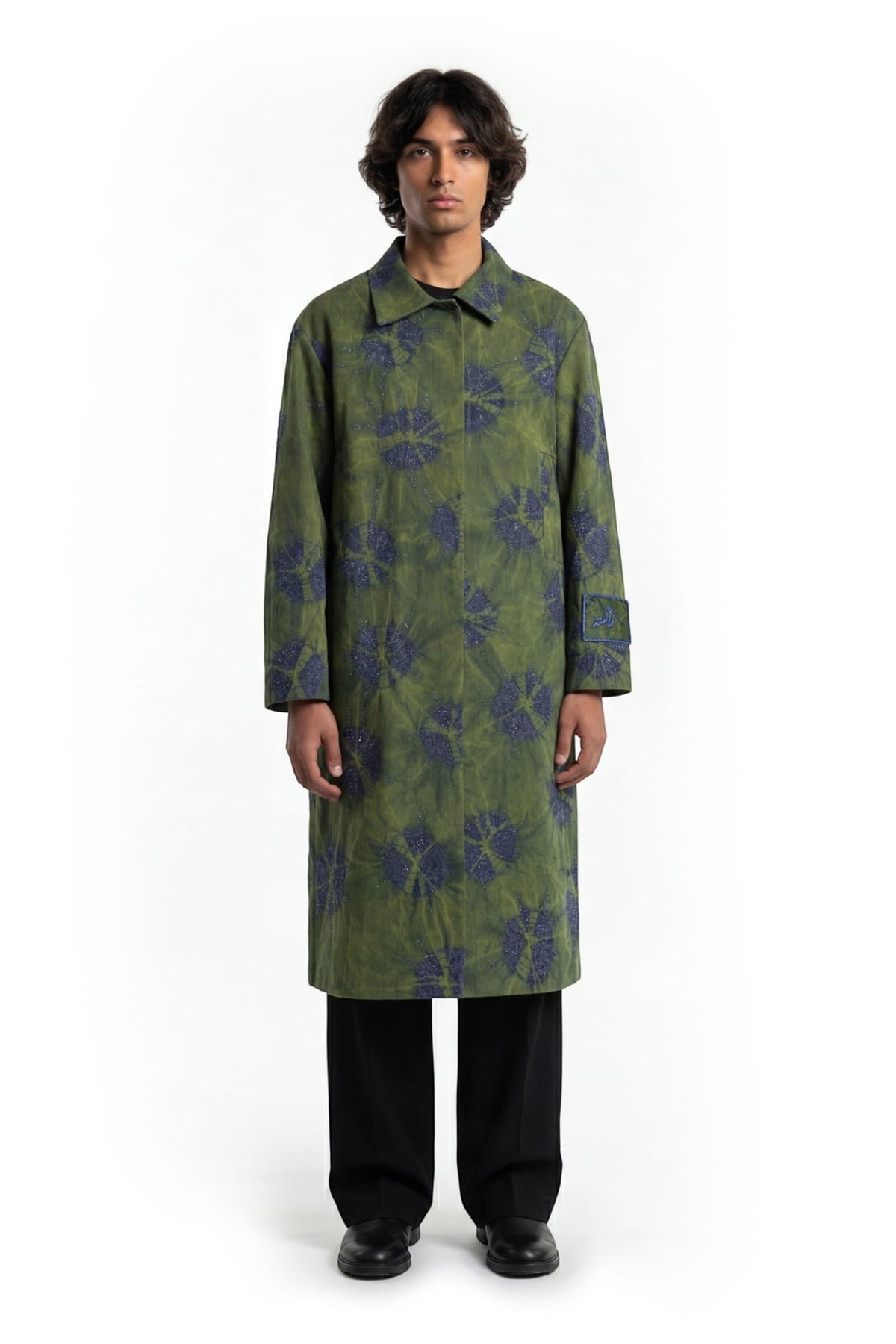 Crafted from denim, this long coat features a relaxed straight silhouette with a shirt collar, concealed placket, and back vent. The surface is developed using a tie-dye technique, creating soft, cloud-like patterns with tonal variation. Abstract cut dana embellishment is scattered across the garment, adding texture and depth. A sleeve patch with cut dana embroidery and border completes the piece with a subtle highlighted detail.