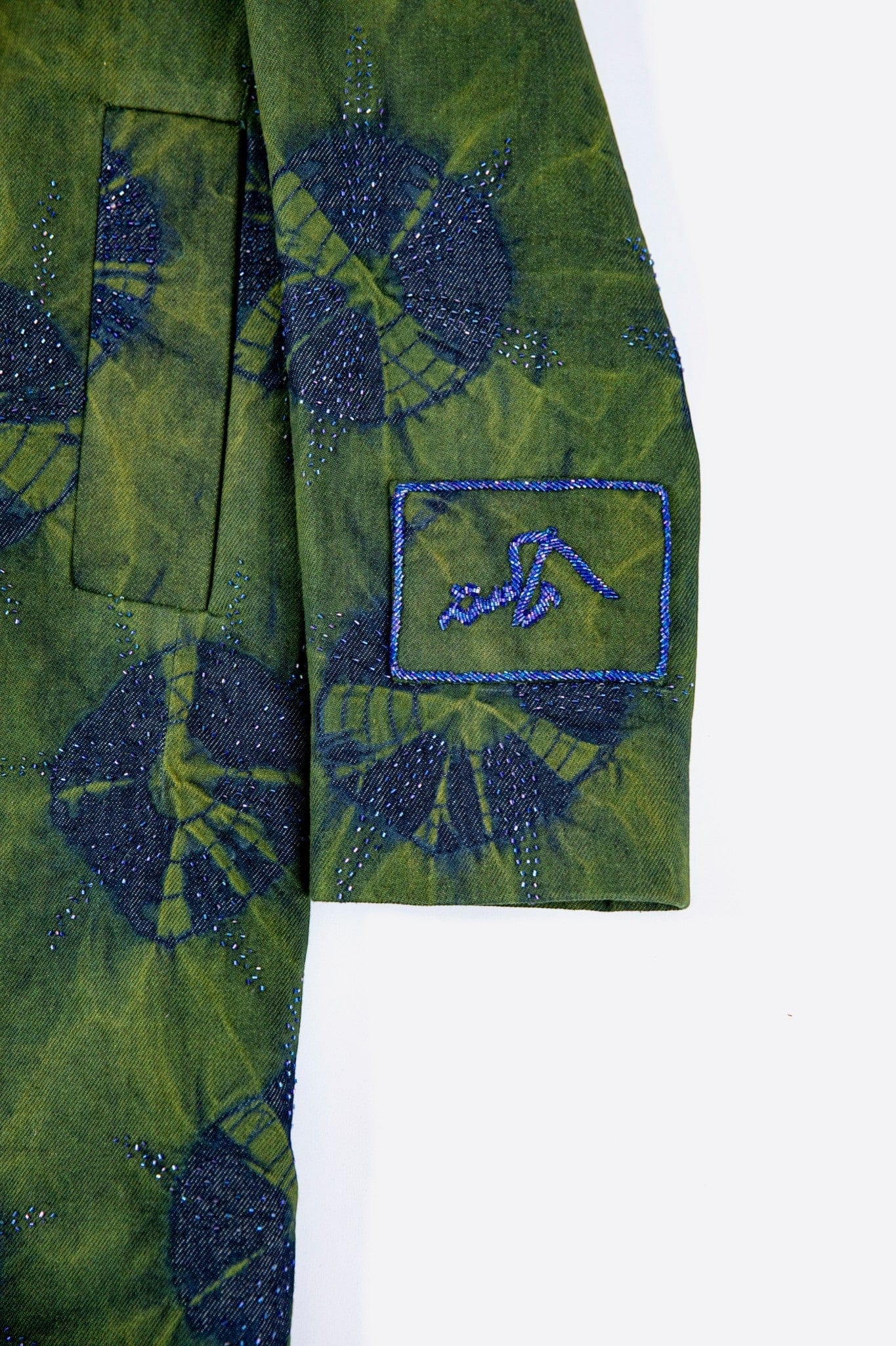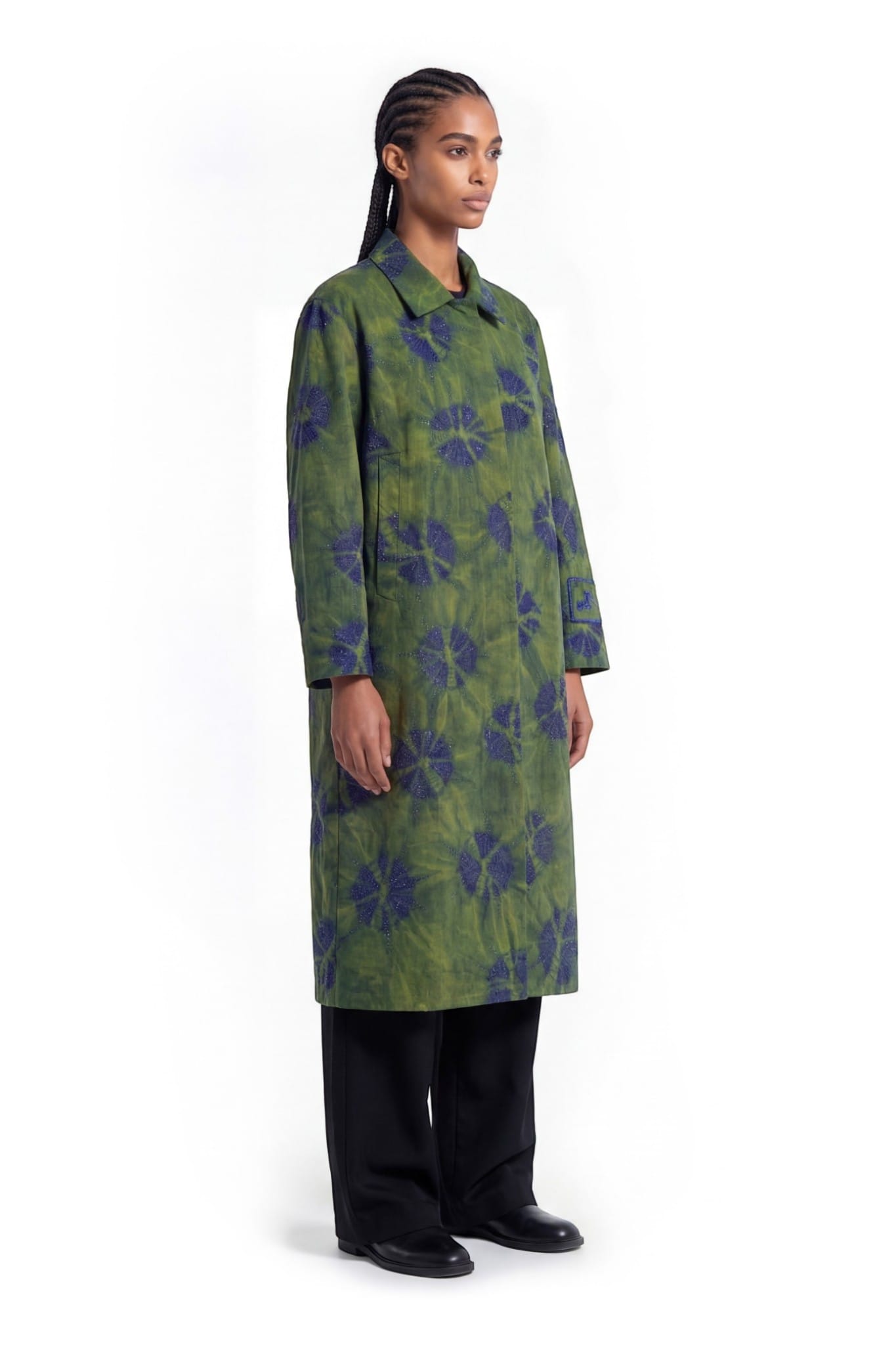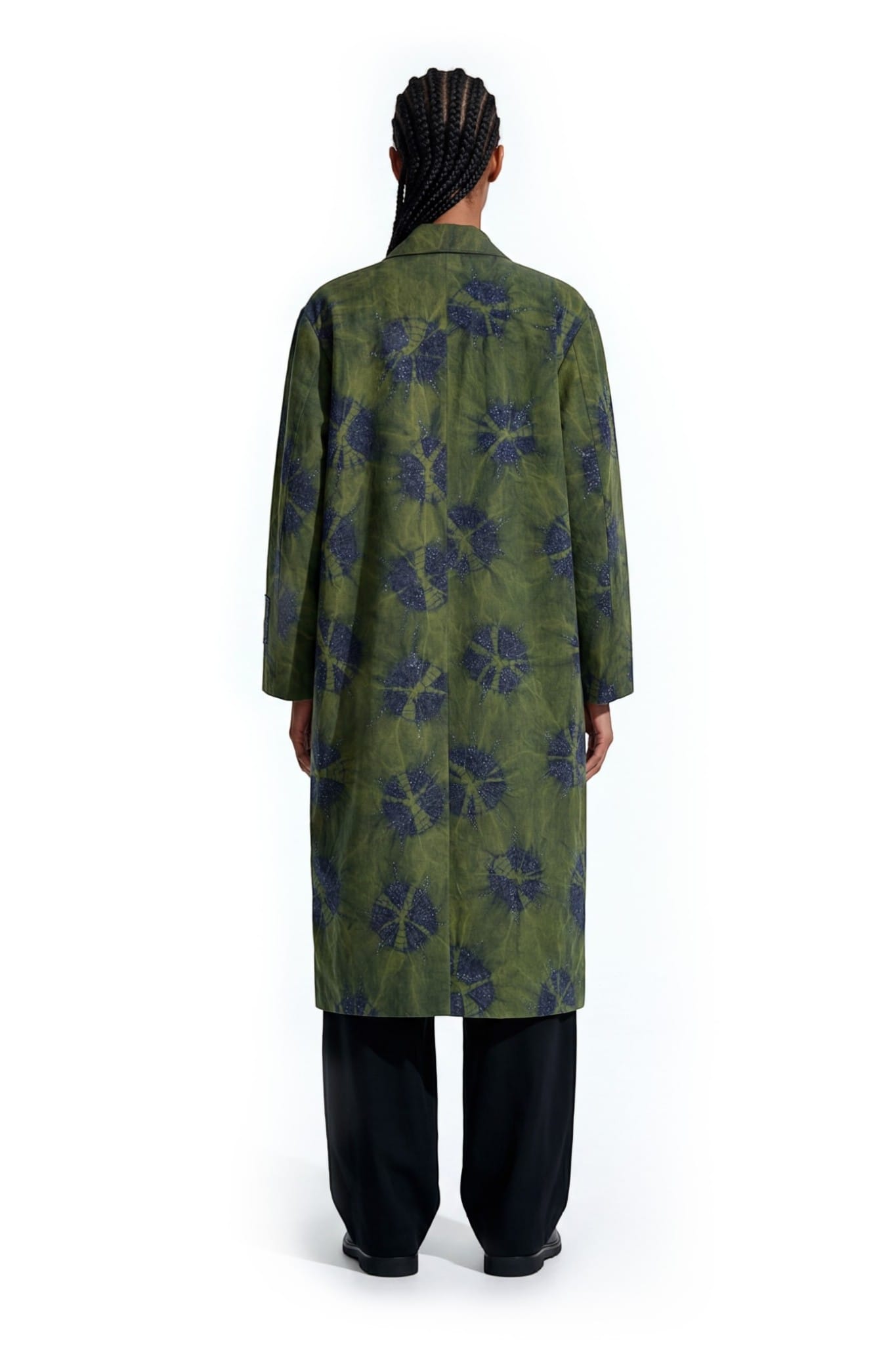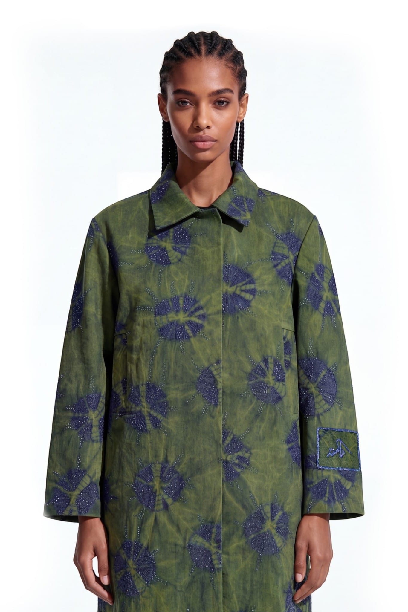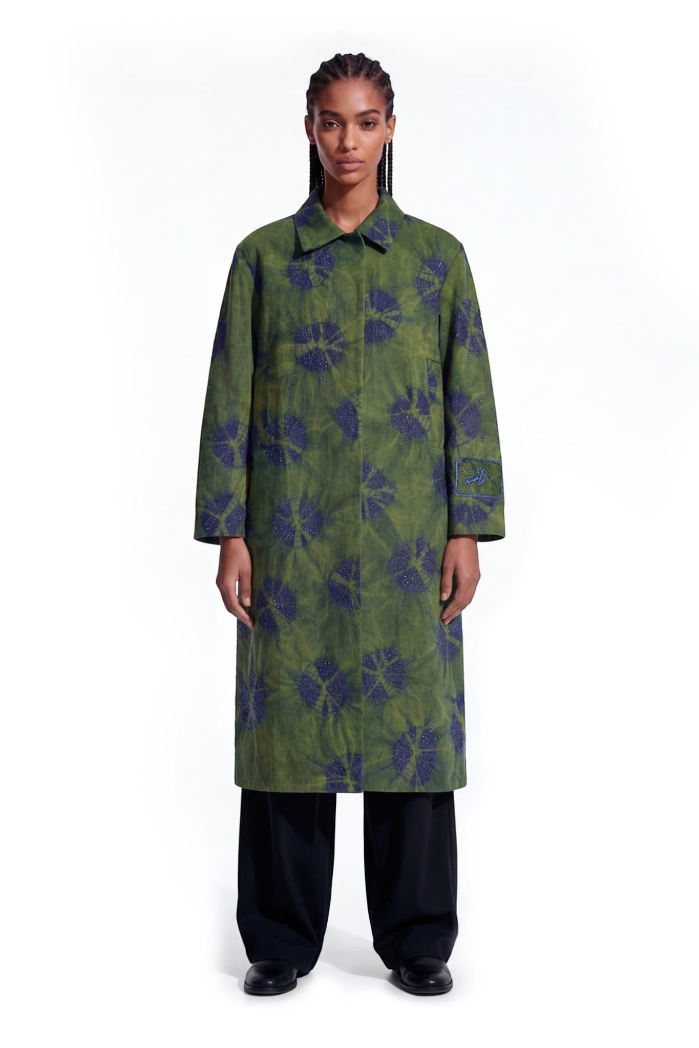 Crafted from denim, this long coat features a relaxed straight silhouette with a shirt collar, concealed placket, and back vent. The surface is developed using a tie-dye technique, creating soft, cloud-like patterns with tonal variation. Abstract cut dana embellishment is scattered across the garment, adding texture and depth. A sleeve patch with cut dana embroidery and border completes the piece with a subtle highlighted detail.