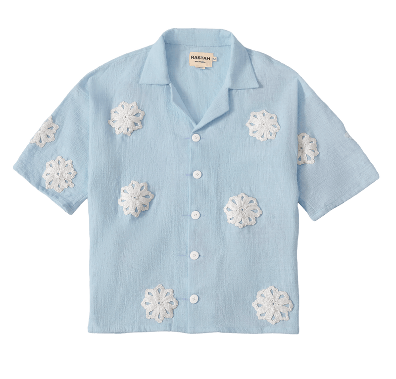 The Handwoven Button Down in blue exemplifies Rastah's appreciation for artisanal craftsmanship. This oversized piece boasts hand-embroidered floral details, adding a unique and elegant dimension to the ensemble. This iconic piece is being brought back in a new colourway after Justin Bieber was spotted wearing it on his trip to Tokyo.