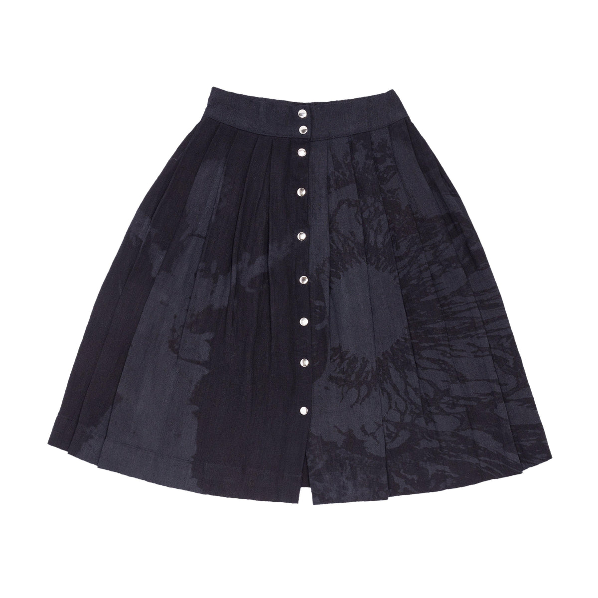 The chaos skirt is a testament to Rastah's ability to experiment and innovate with traditional artisanal techniques whilst maintaining a modern design aesthetic. The garment is constructed from handwoven and had dyed cotton fabric which is then laser printed. Knife pleated detailing is added for and edgier appearance. The piece includes snap buttons on the front for added contrast. Style this piece with our hand woven printed polo for the perfect nighttime party ensemble.