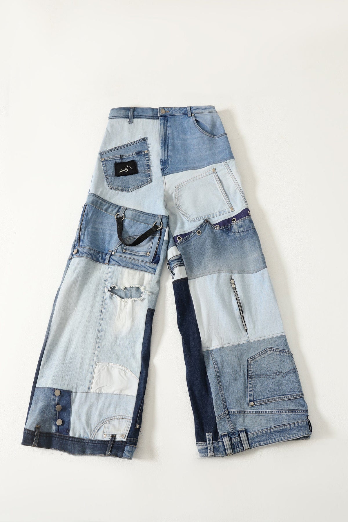 The Upcycled Denim Jeans form an integral part of the Rastah collection. Assembled from discarded jeans, they adopt a baggy fit while exhibiting an array of paneled details, ailiets, and the Rastah logo as a patch. These jeans serve as a unique and sustainable interpretation of the quintessential denim aesthetic.