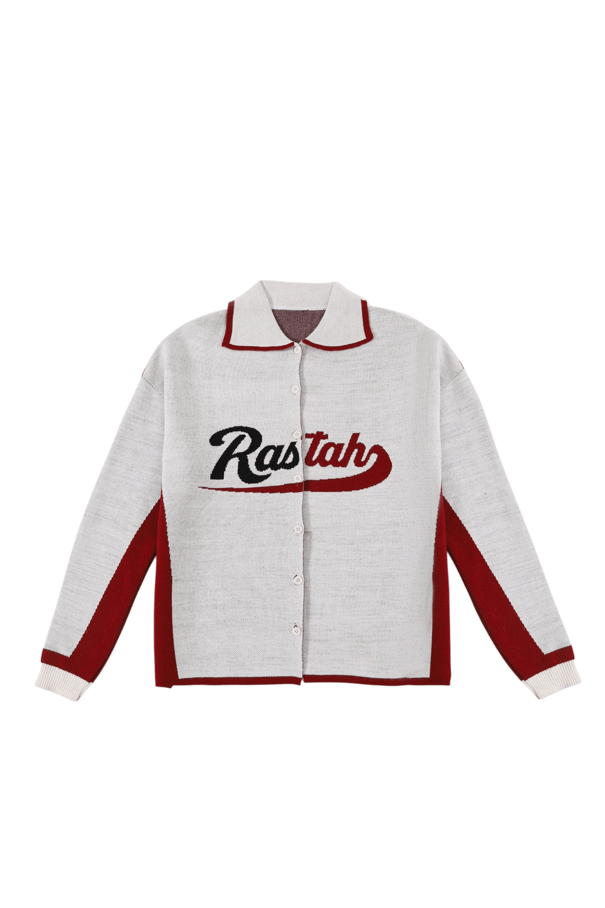A nostalgic nod to vintage jerseys popular during the iconic 90's. Tailored from 100% acrylic yarn knit, this oversized button-down proudly features a customized Rastah logo, drawing inspiration from the iconic emblems seen on vintage baseball jerseys frequently donned by 90's hip-hop artists. The red and white block pattern, reminiscent of baseball jerseys, evokes a nostalgic atmosphere, offering a timeless appeal. The knit collar and graphic on the back add a touch of uniqueness