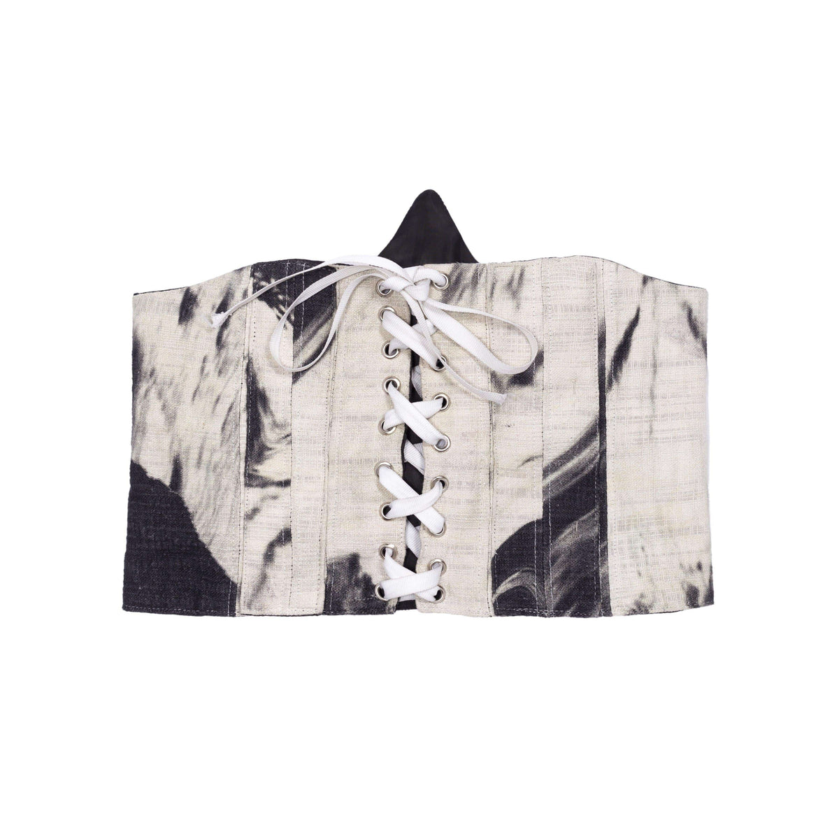 The corset is constructed from handwoven fabric and includes a digitally printed design in shades of black and grey.